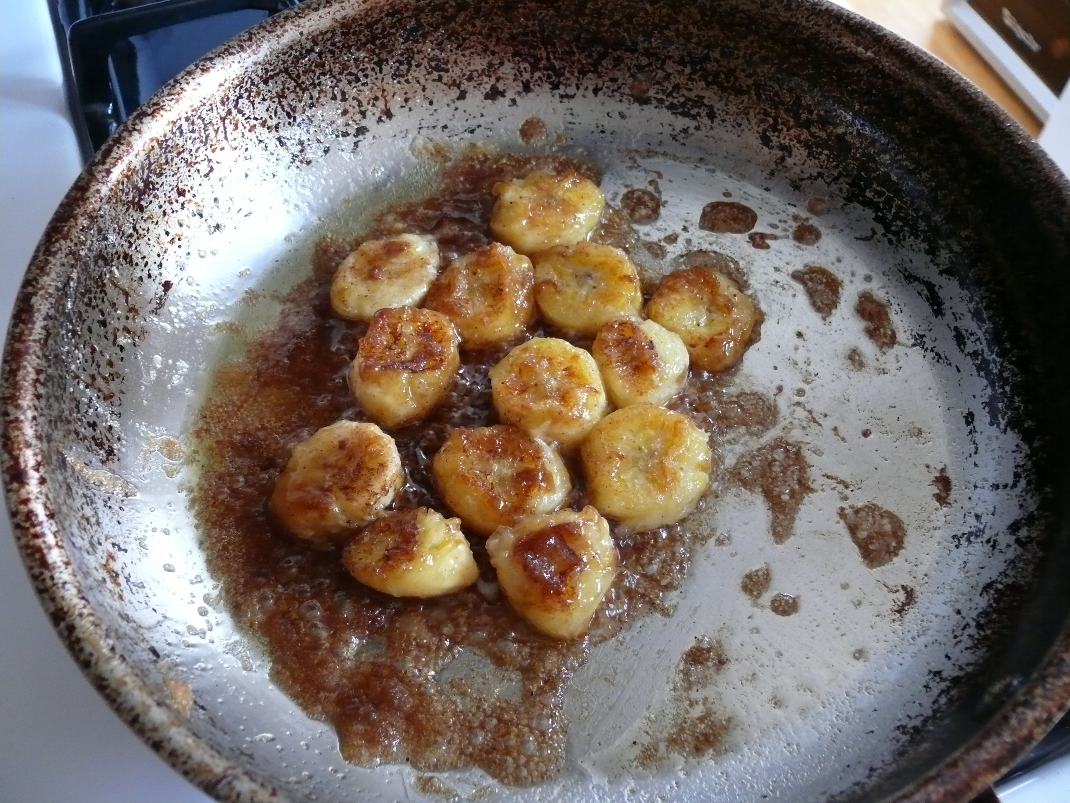 - Heat the butter in a skillet and  add the bananas. After a minute turn the bananas over and add the brown sugar, cinnamon and vanilla. Let simmer for a couple of minutes, then turn off the heat.