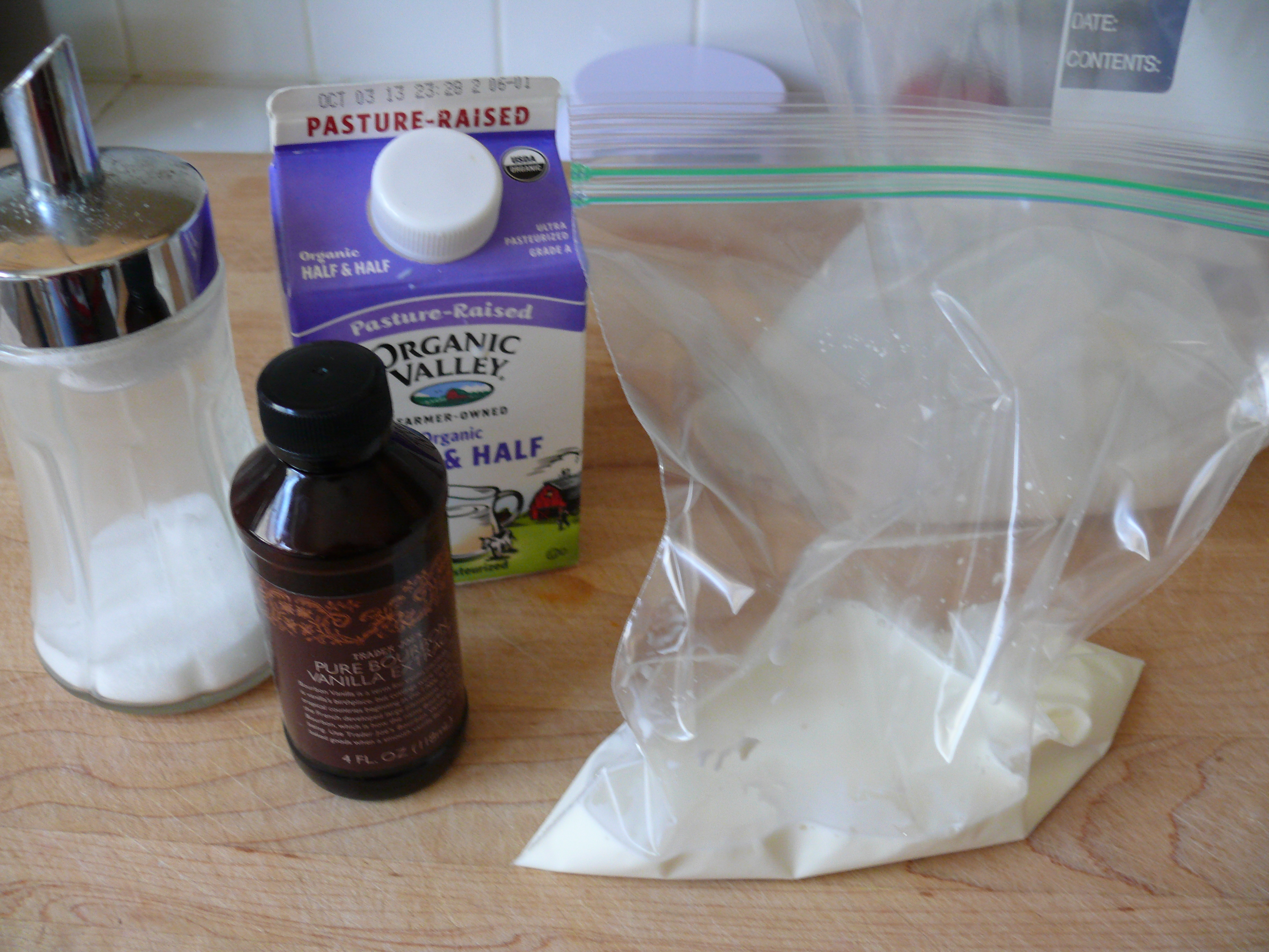 - Meanwhile, in 1 quart ziplock add the half & half, sugar and vanilla. Seal the bag and then but it in the second quart ziplock (this will prevent any salt leaking into your ice cream!).