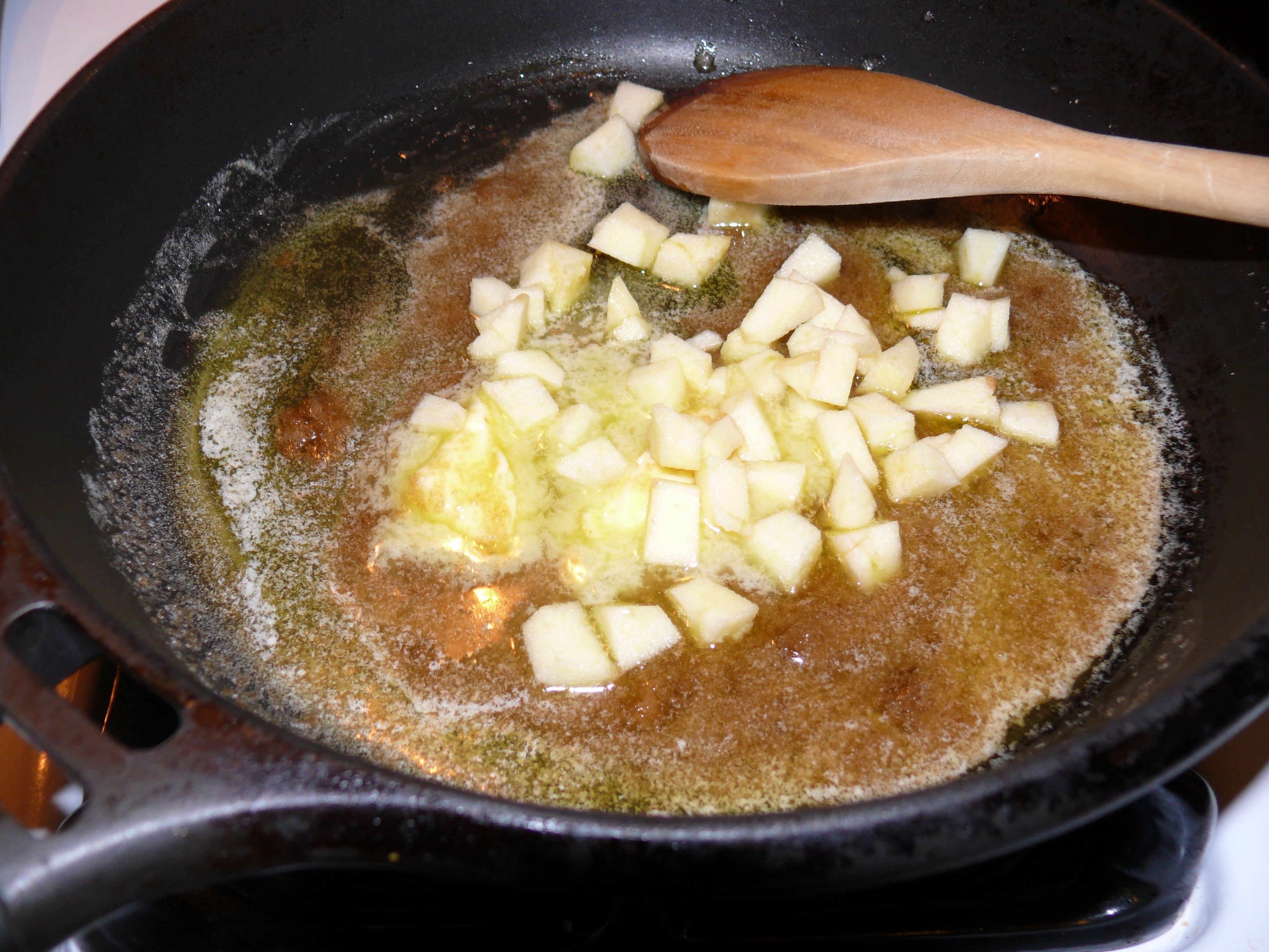 - Add the butter, brown sugar and apples to a skillet and cook until the apples are tender, pour equal amounts in the bottom of three muffin tin wells.