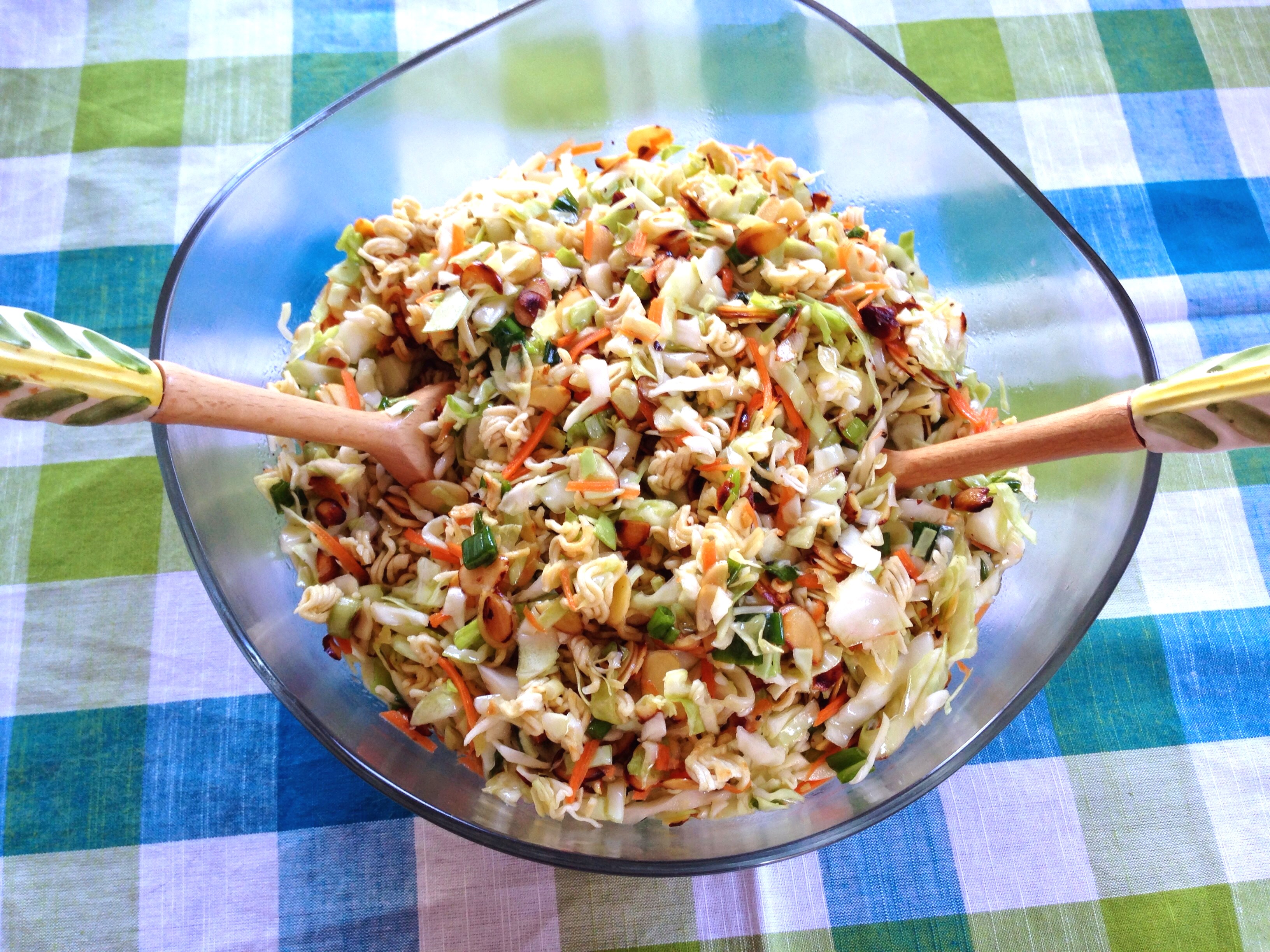 Asian ramen salad is actually a total American potluck classic. The salad is a mixture of coleslaw (cabbage and carrots basically), almonds, and dried ramen noodles tossed in a sweet and lightly tangy dressing. I love the crunch of the ramen noodles and the toastines of the almonds!