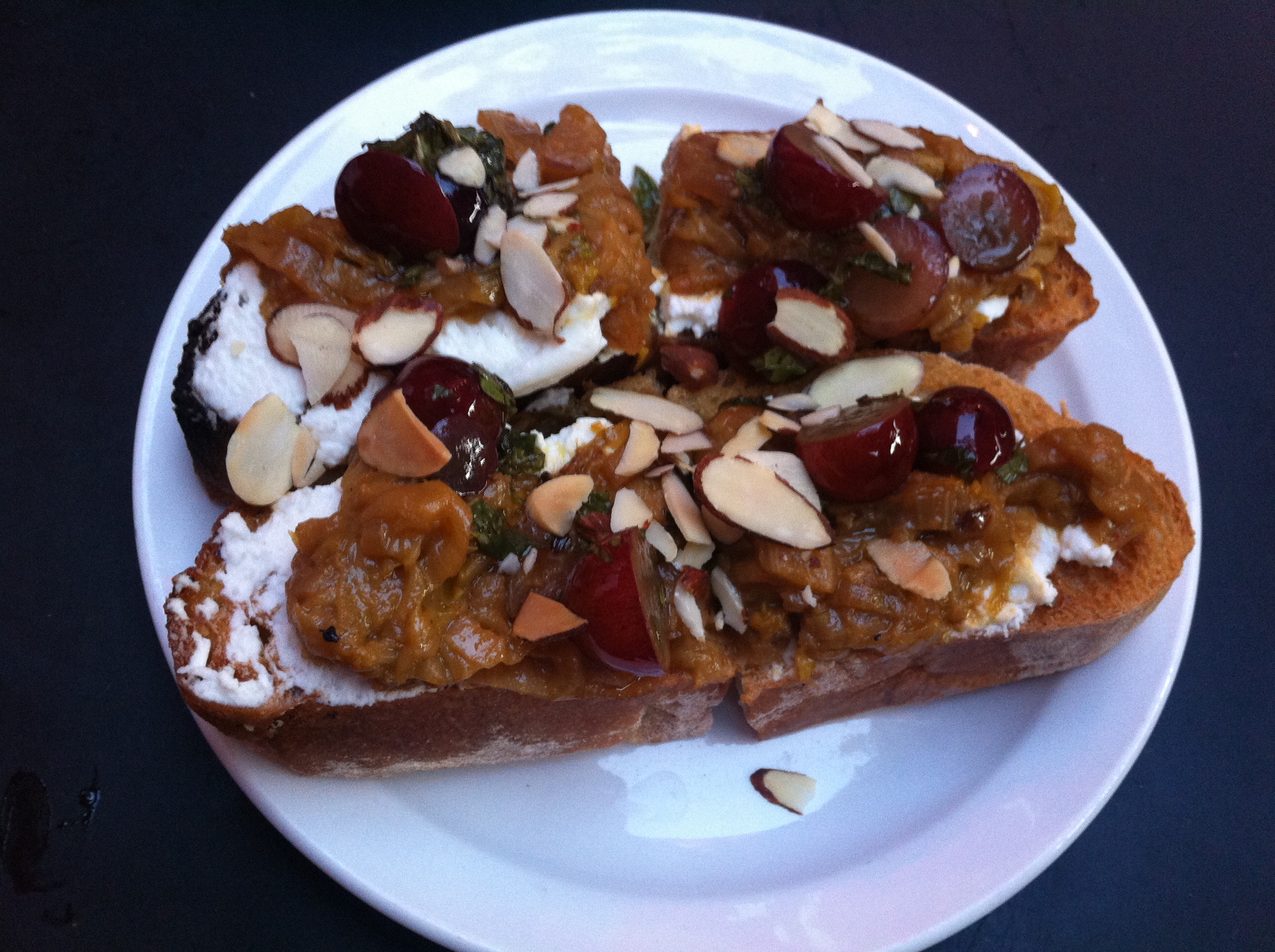 Then we had these really yummy toasts with goat cheese, grapes and slivered almonds…