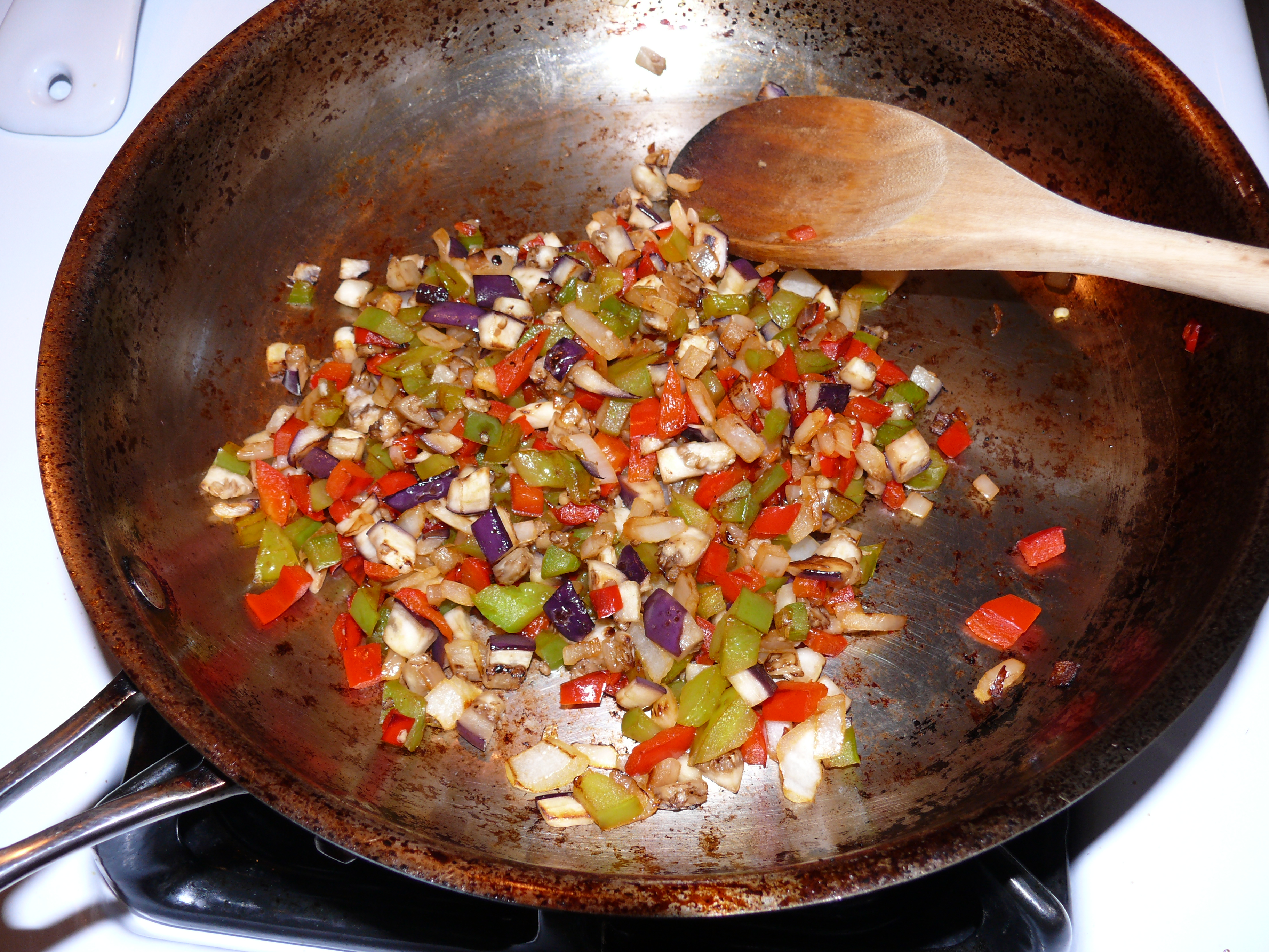 - Heat olive oil in a skillet and saute the bell peppers for a couple of minutes. Add the onions and eggplant and saute until all the vegetables are a little soft.
