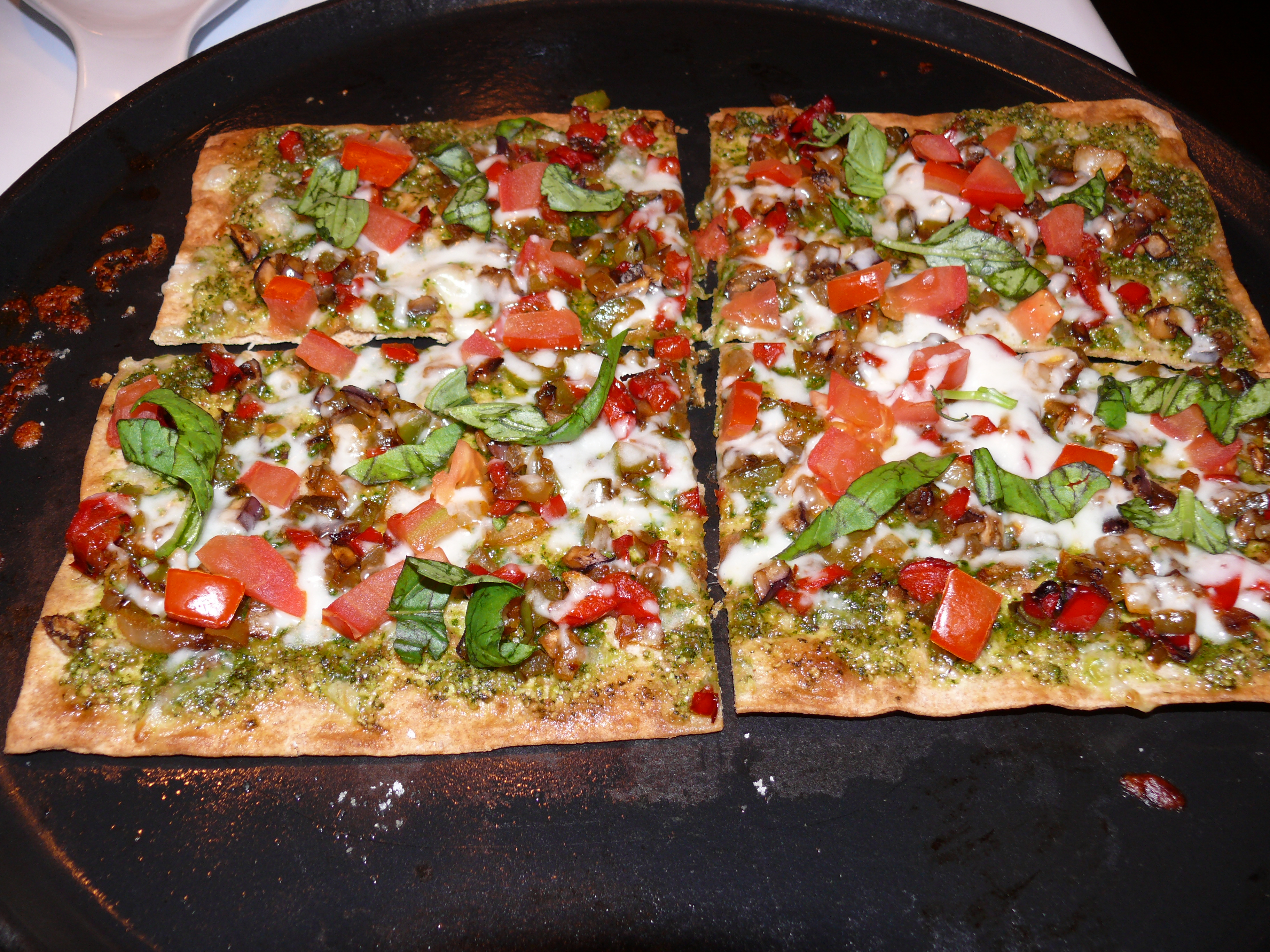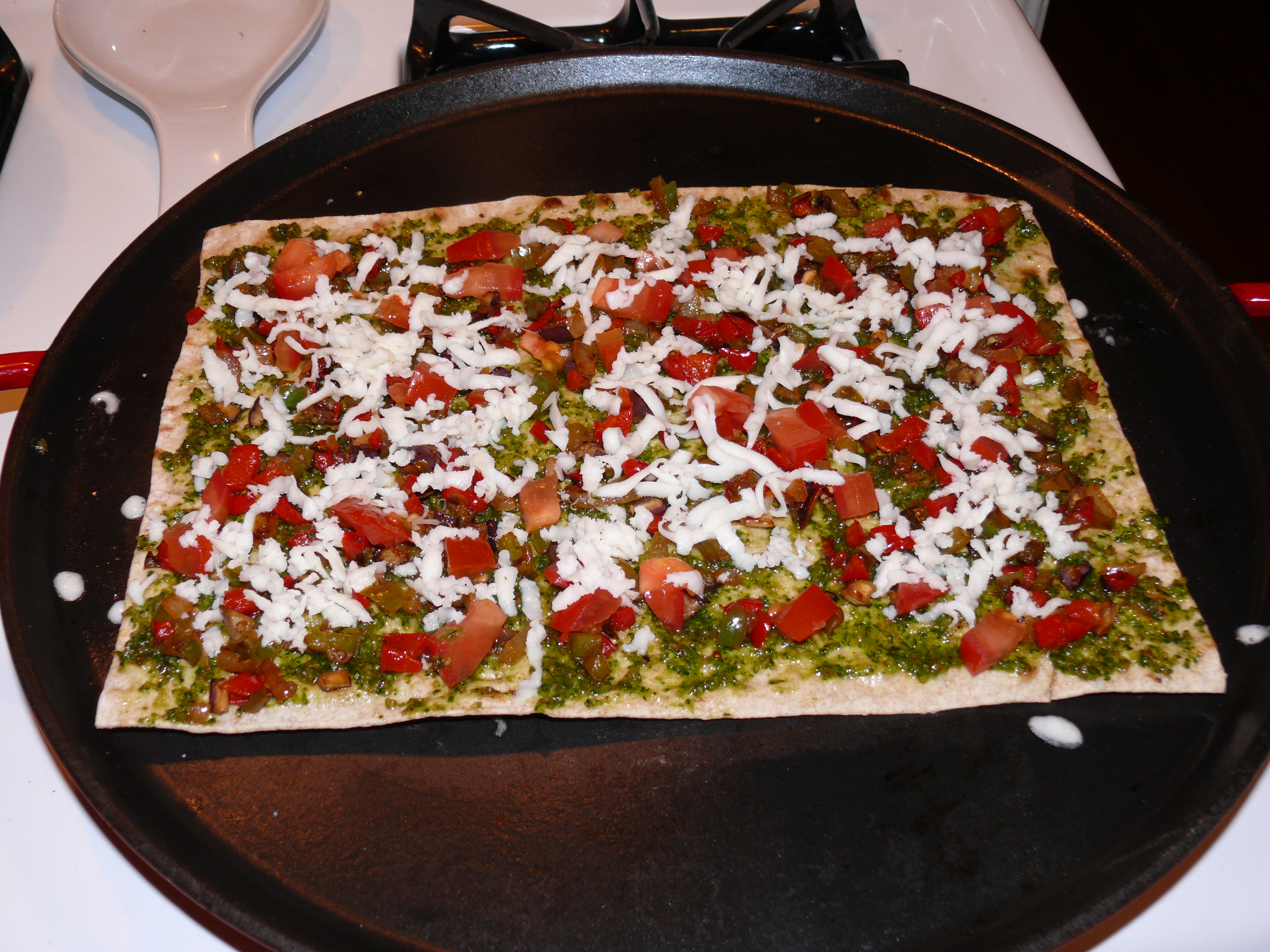 Oh my! I have decided that I must always have lavash and mozarella in the fridge for an impromptu pizza! Today I tried a version using Trader Joe’s whole wheat lavash with basil almond pesto, sauted onions, bell peppers, and eggplant, tomatoes, and mozarella and wow was it good! Now I’m thinking of all the other possibilities: carmelized onions and goat cheese, simple tomato, basil mozarella, mixed sauteed mushrooms, etc…