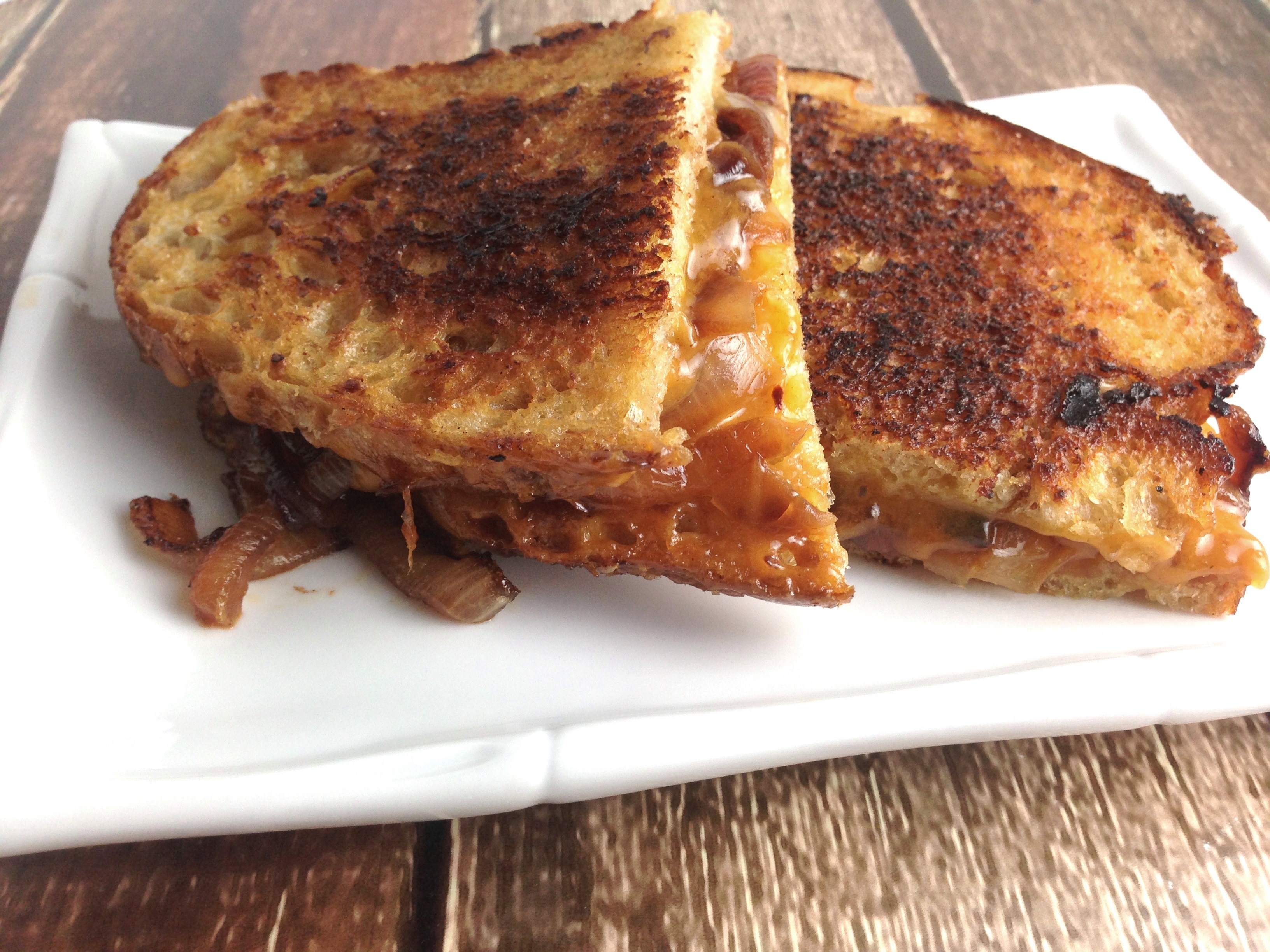Recipe is adapted from Ring Finger Tan Line’s Sweet and Spicy Caramelized Onion BBQ Grilled Cheese.