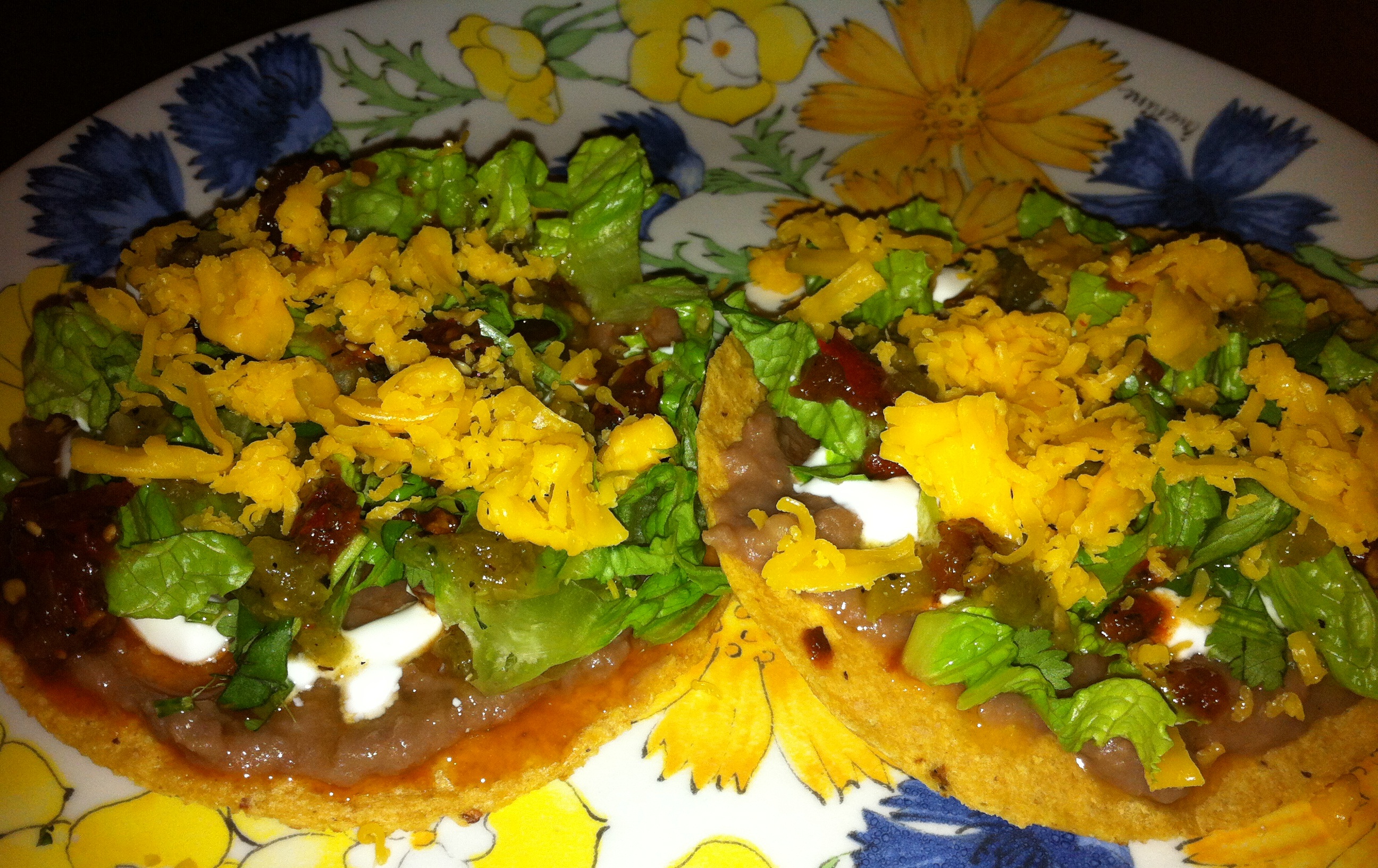 2 tostada shells (you can buy them at the market or deep fry a couple of corn tortillas until crisp)