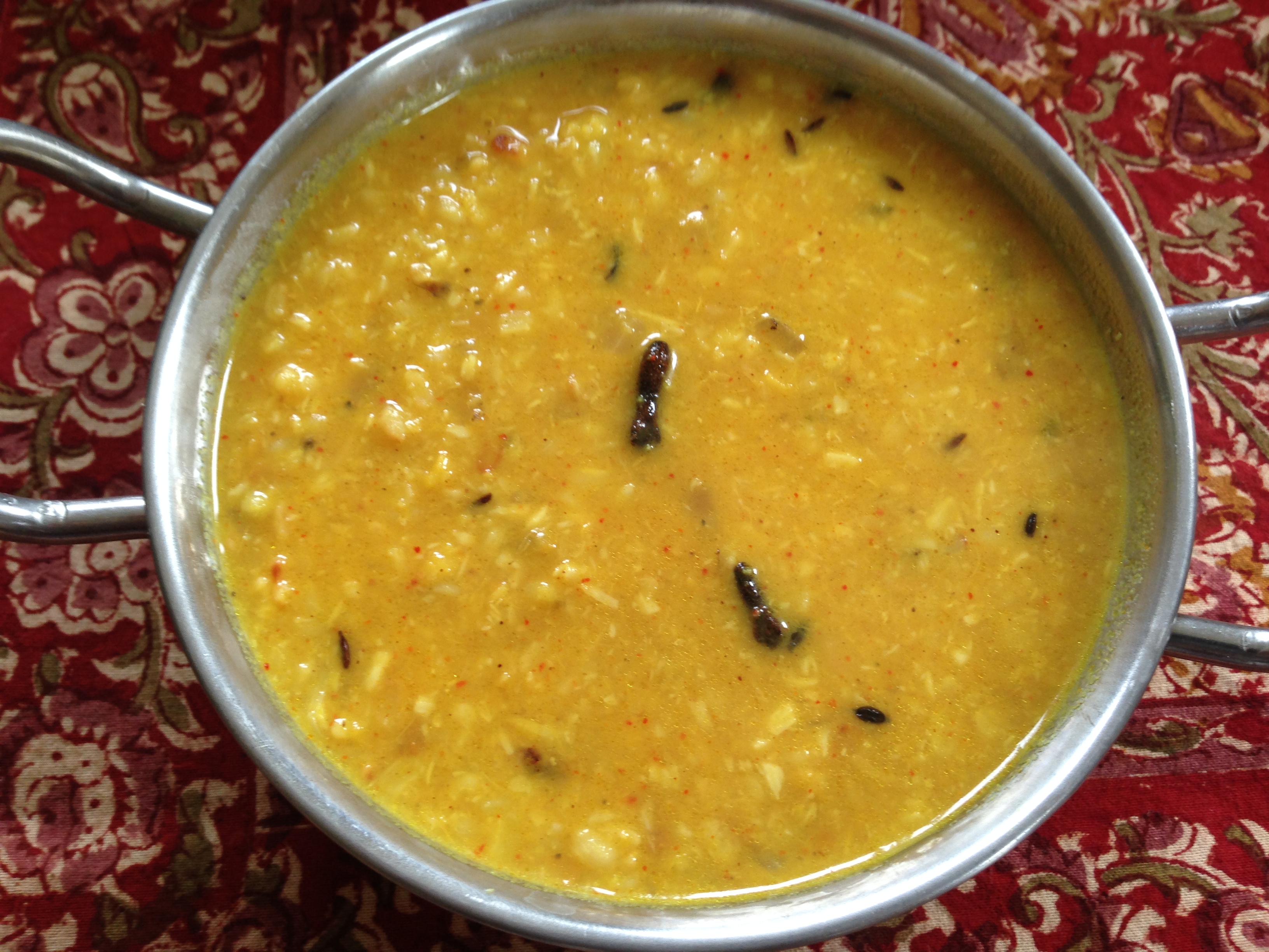- Heat mustard oil in a pressure cooker. Add onions and saute until a little browned. Throw in the dal, coconut (if using frozen, no need to defrost), turmeric, and 4 cups of water and pressure cook for 5-7 minutes (I bring the pressure cooker up to pressure on high, then turn to medium, and run under cold water to get the steam out before taking off the lid).