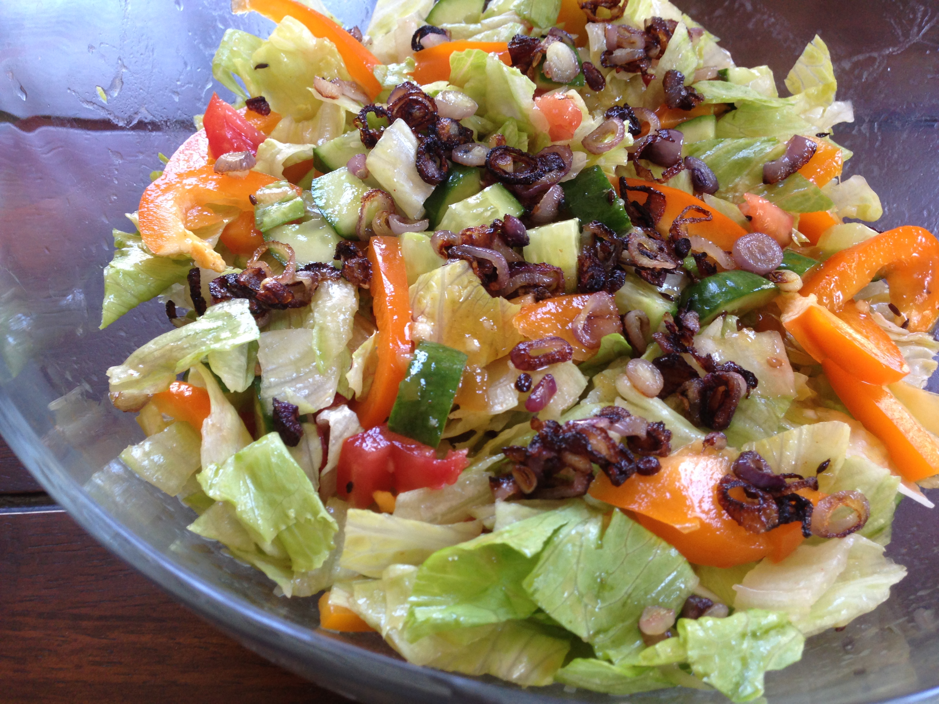 We were having paneer tikka and I wanted something light and fresh to go with it, so I created this light and crisp salad with a toasted cumin and mango chutney vinaigrette. The ice berg lettuce, fresh vegetables and fried onions were a perfect balance to the heavy paneer. I don’t normally use iceberg, but it was absolutely perfect in this. I wanted it to be a crisp background rather than have a strong flavor.