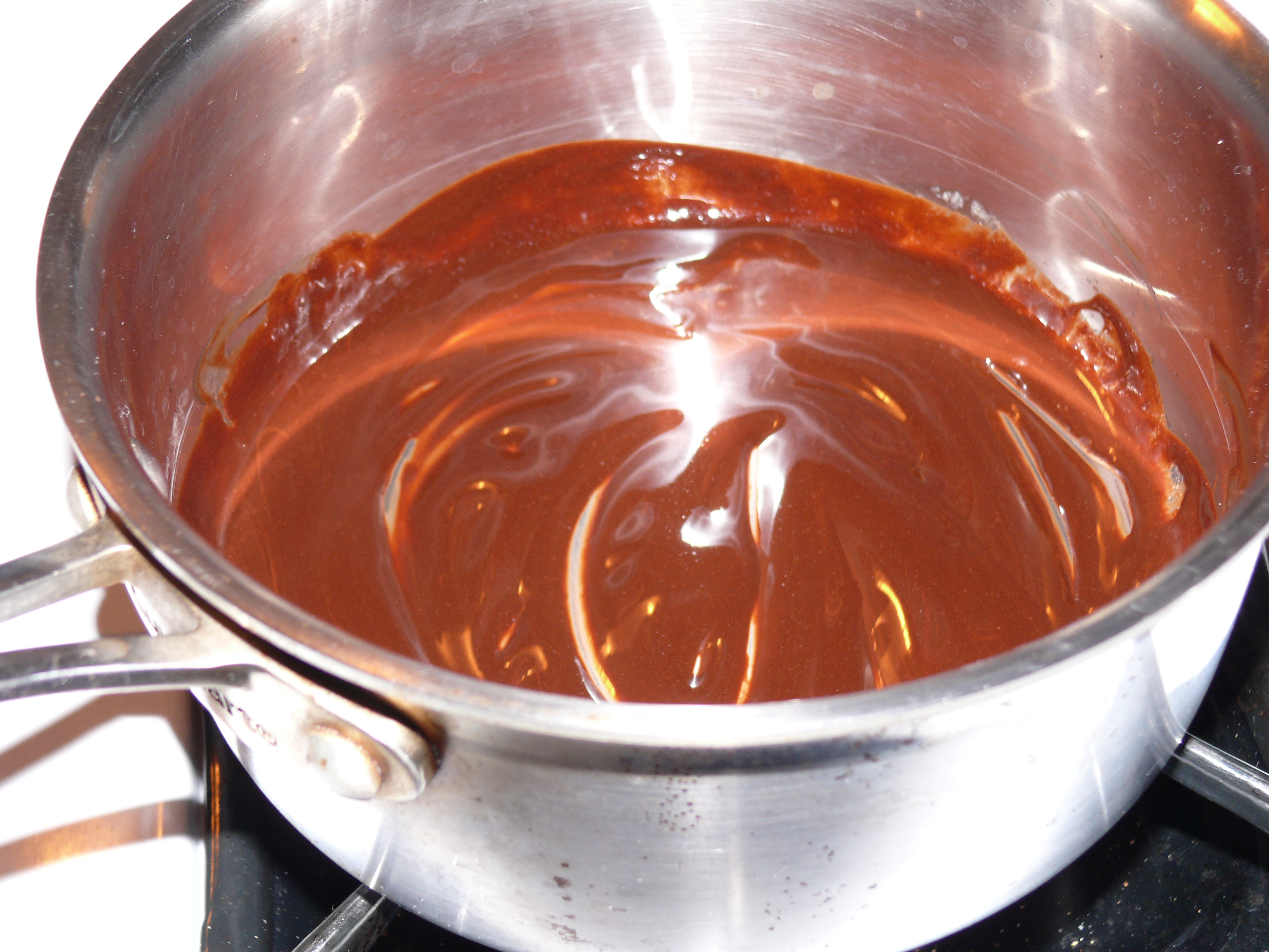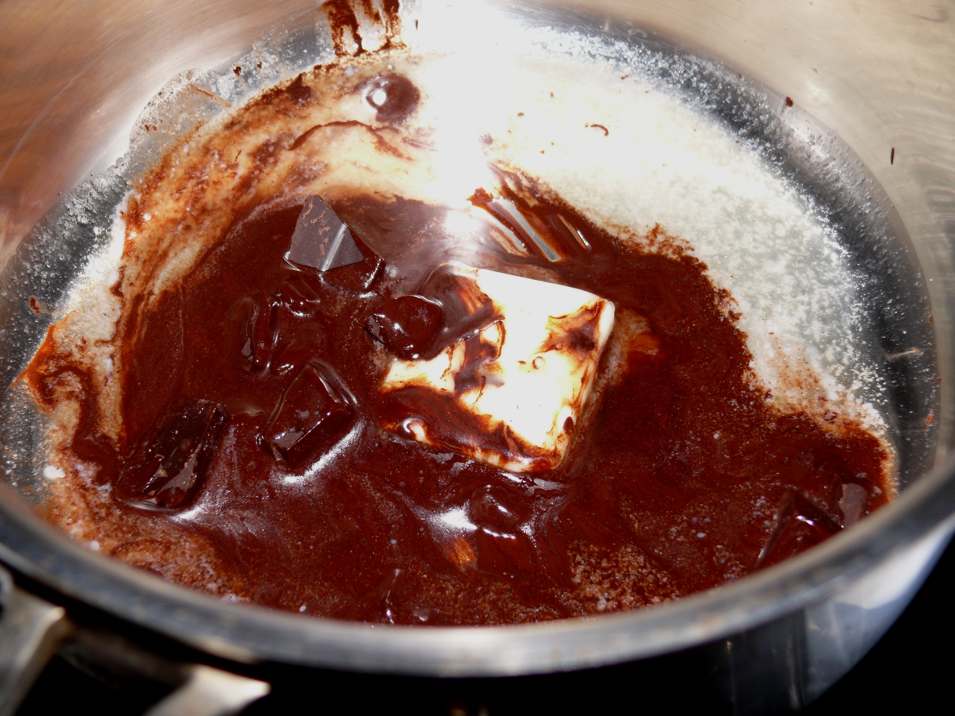 - Melt baking chocolate and butter on really low heat in a small sauce pan until just melted.