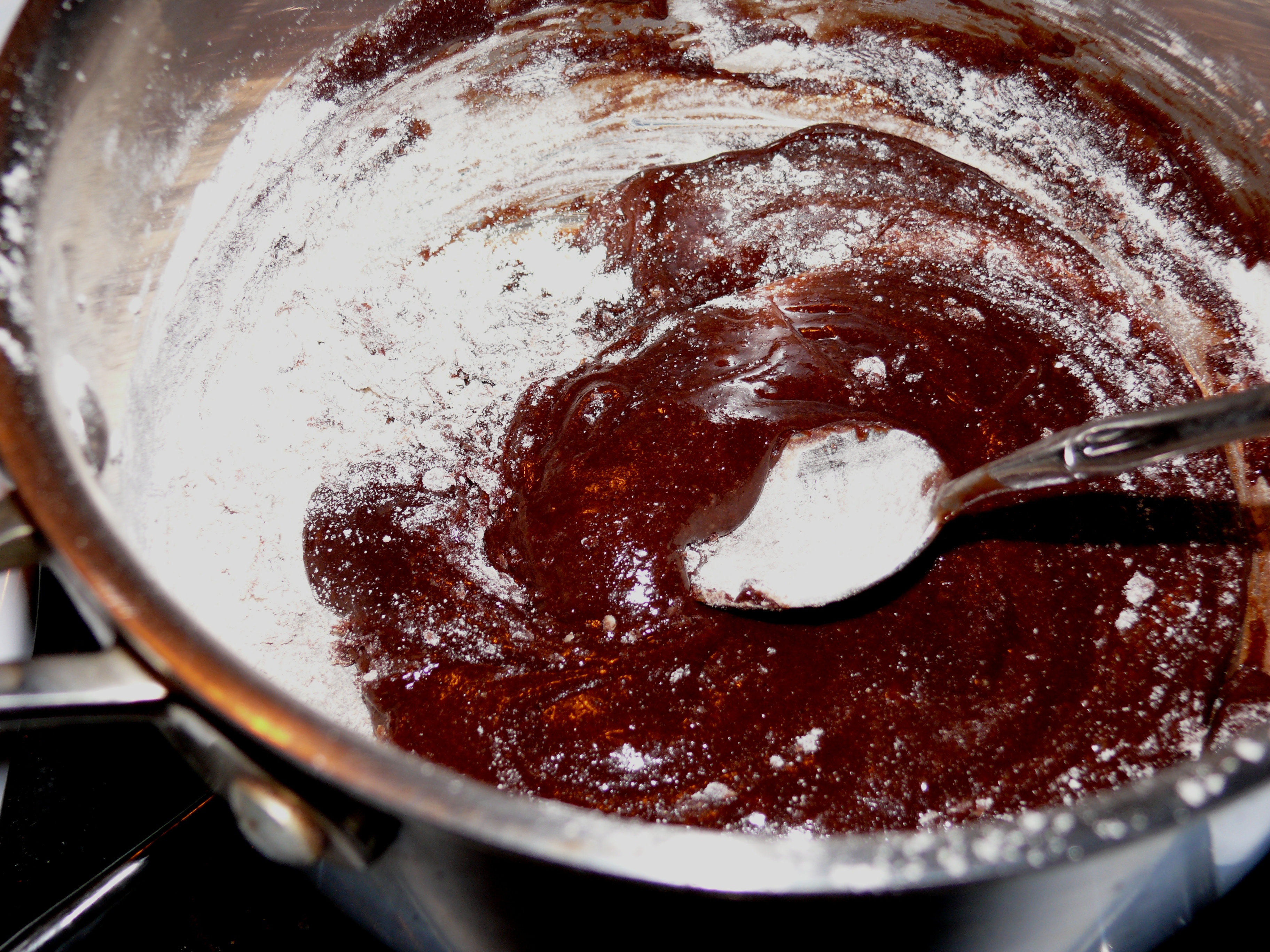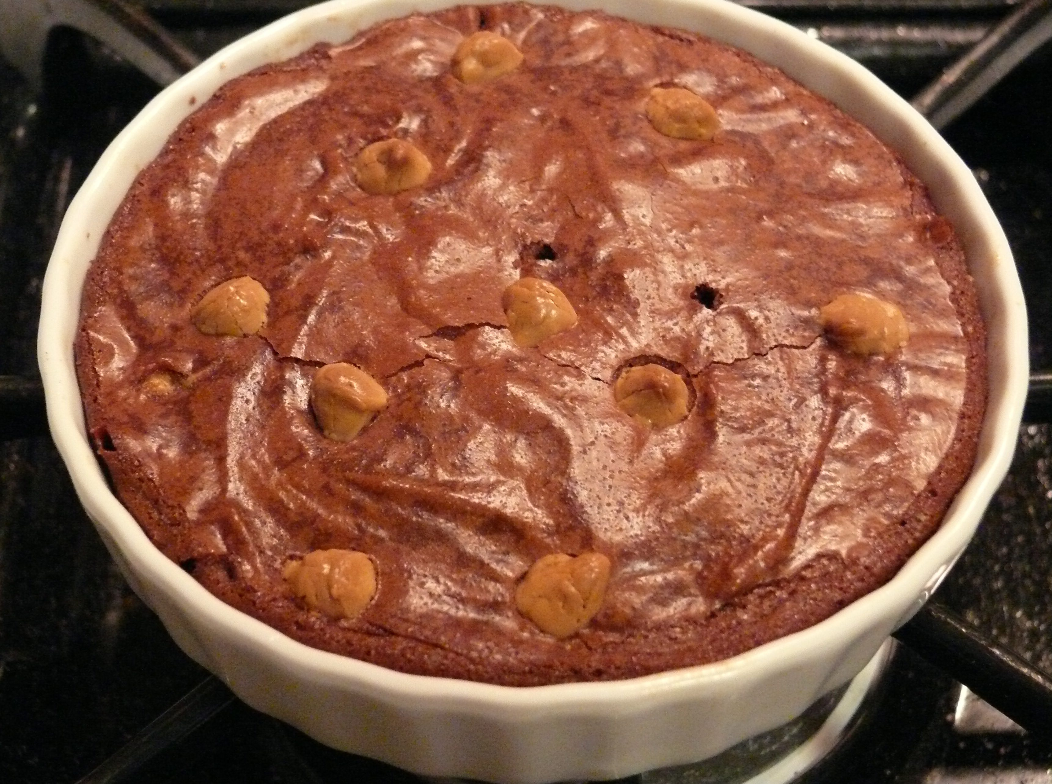 For these brownies I cut the recipe in 4th, keeping the same proportions of ingredients. This recipe can make 4 brownies, but I think it makes more like 1 or 2! The only things I did differently was use whole wheat flour–trying to be a little healthy :-), and I melted the chocolate and butter right in the pan instead of using a bowl over boiling water or double boiler (I was very careful to not let it burn!). They were delicious right out of the oven (which is when I ate them), but I am thinking they would have gotten heavier once cooled because of the whole wheat flour. If I were to bring these somewhere, I would opt for normal flour like Smitten Kitchen’s original recipe.