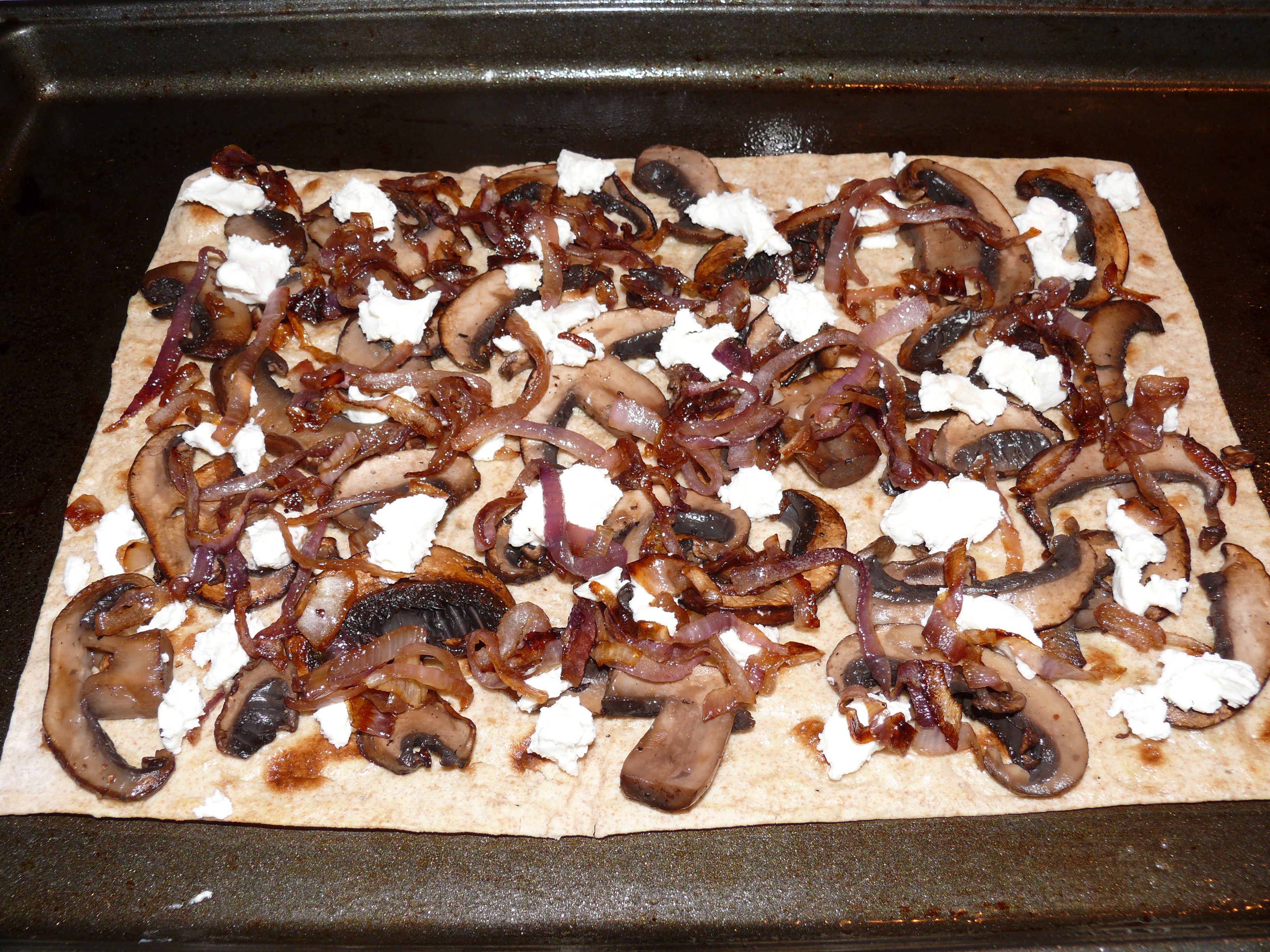 - Flip over, brush with olive oil, and arrange mushrooms, onions and goat cheese on top.