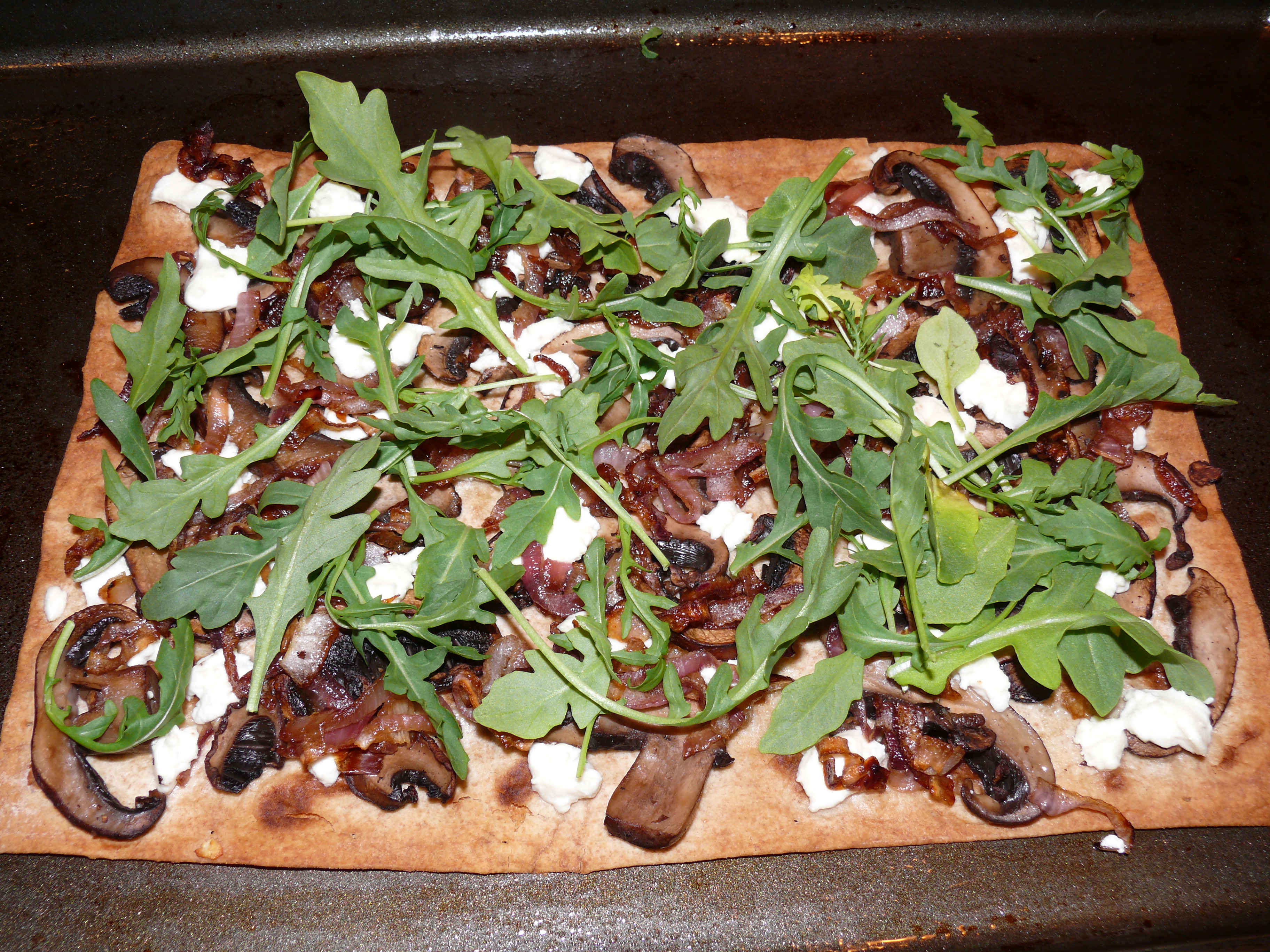 I had some small portobello mushrooms and decided to saute them and add them as well. The combination of juicy chewy mushrooms, tangy goat cheese, umami-ish caramelized onions, and peppery arugula was awesome!