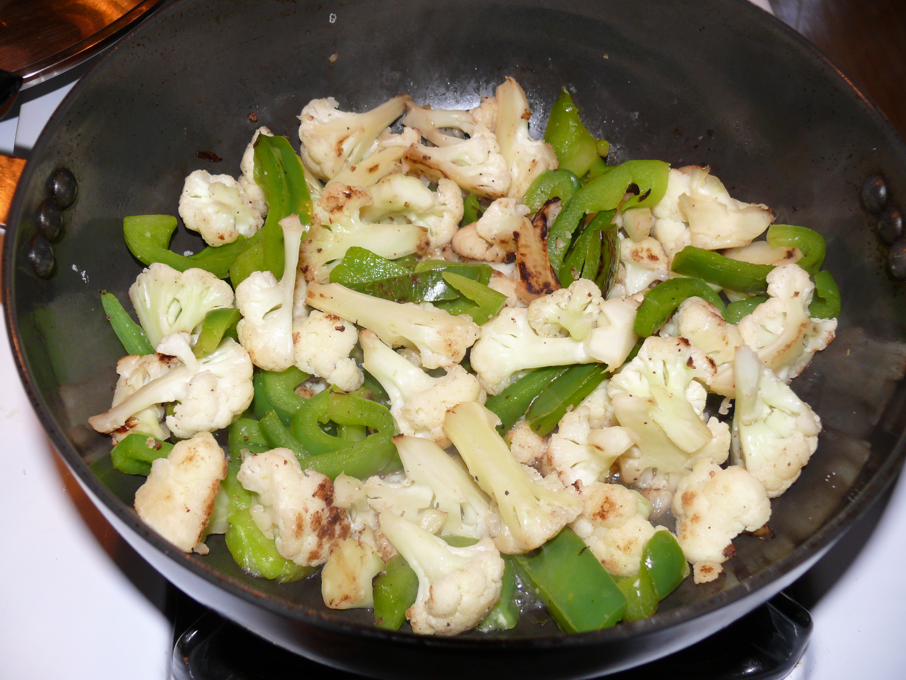 - Heat ghee in a medium stock pan and add the cauliflower and cook for a few minutes over fairly high heat stirring a bit. Add bell pepper and continue to cook for a few minutes. Add a little water and salt, cover and continue to cook until the bell pepper and cauliflower are soft. Remove from pan.