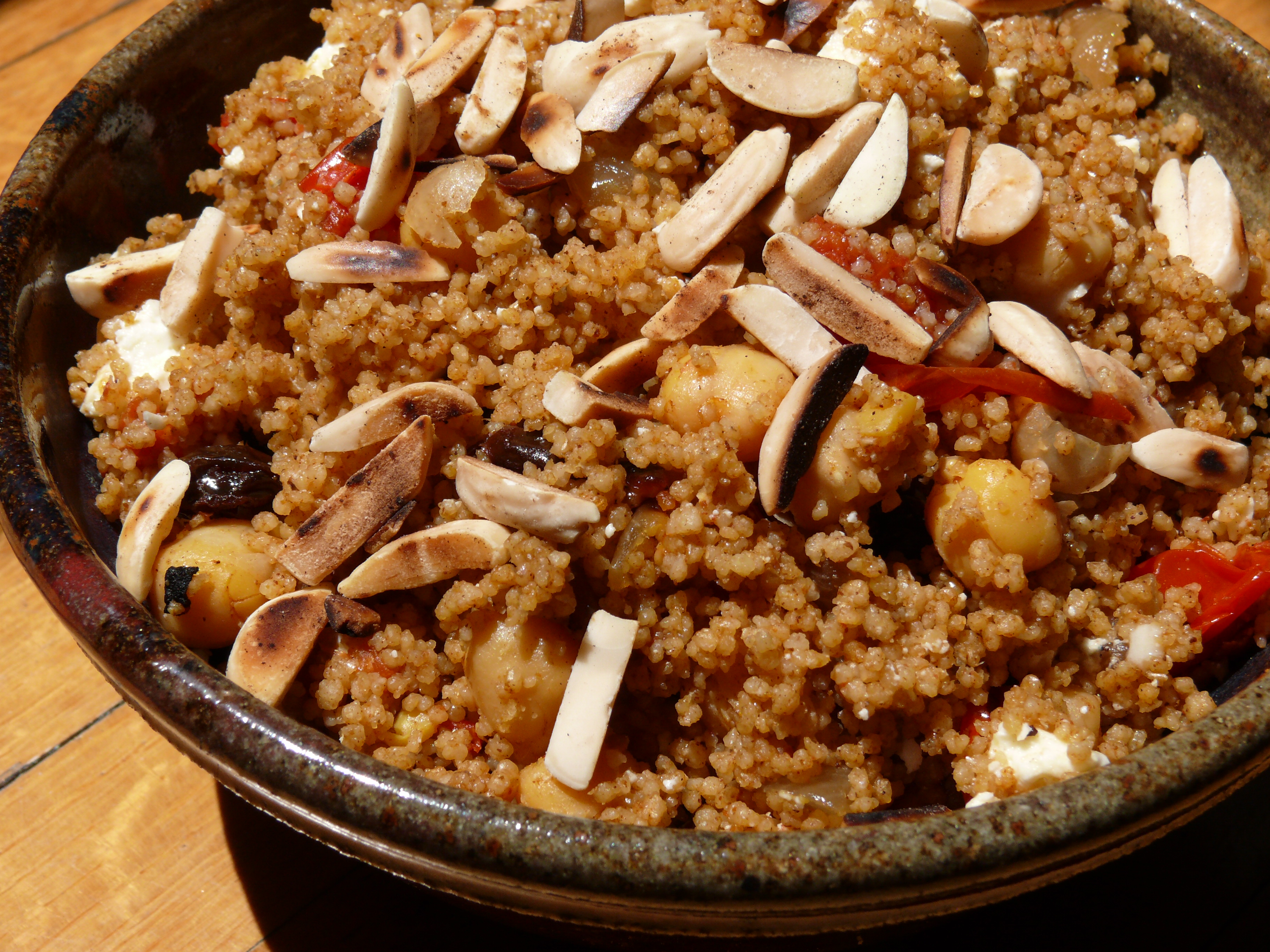 This isn’t an authentic Moroccan dish, but uses couscous, chick peas and Ras El Hanout which is an amazing Moroccan spice blend. There are so many flavors packed into this easy little dish! The raisins give it sweetness, the feta rich saltiness, and toast almonds a perfect nutty flavor.