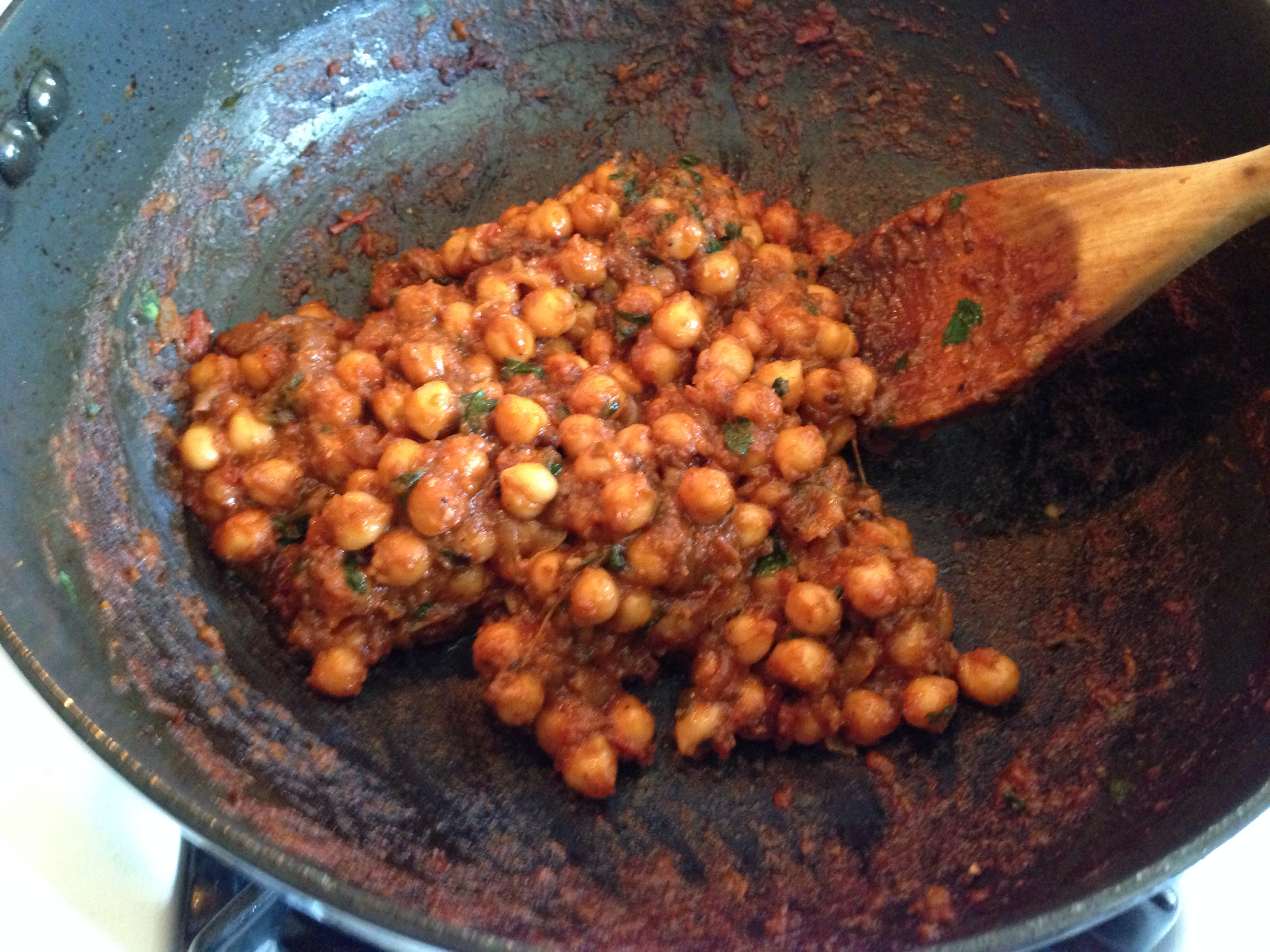 - Add the chick peas, the onions that were set aside, 1/2 cup of water, salt and cilantro and cook until the water is mostly evaporated and you’re left with chickpeas in a spicy tomatoey gravy.