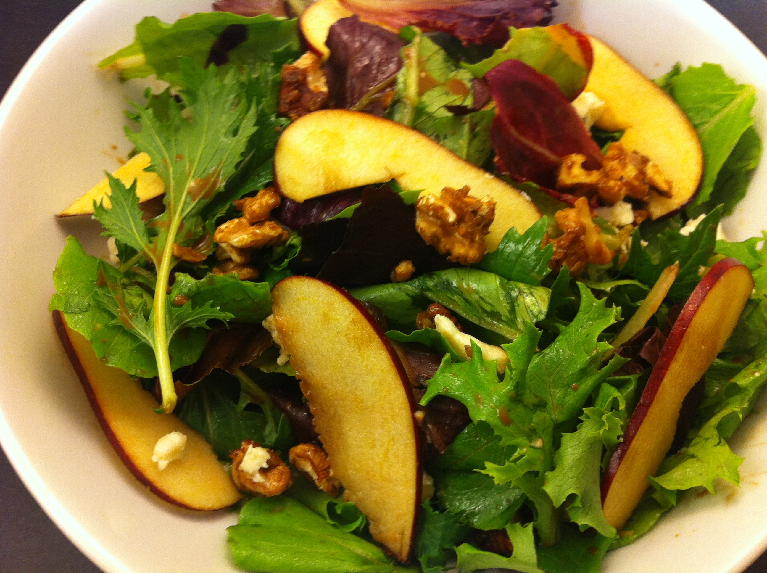 Pine nuts and dried cranberries are wonderful in this salad, but as long as you have a toasted nut and a fruity item, you’re good to go! I have used toasted almonds and candied walnuts for the nuts, and I’ve used grapes for the fruit. I think pecans and apples would work too! I left out the cheese from the original recipe but it would be good too.