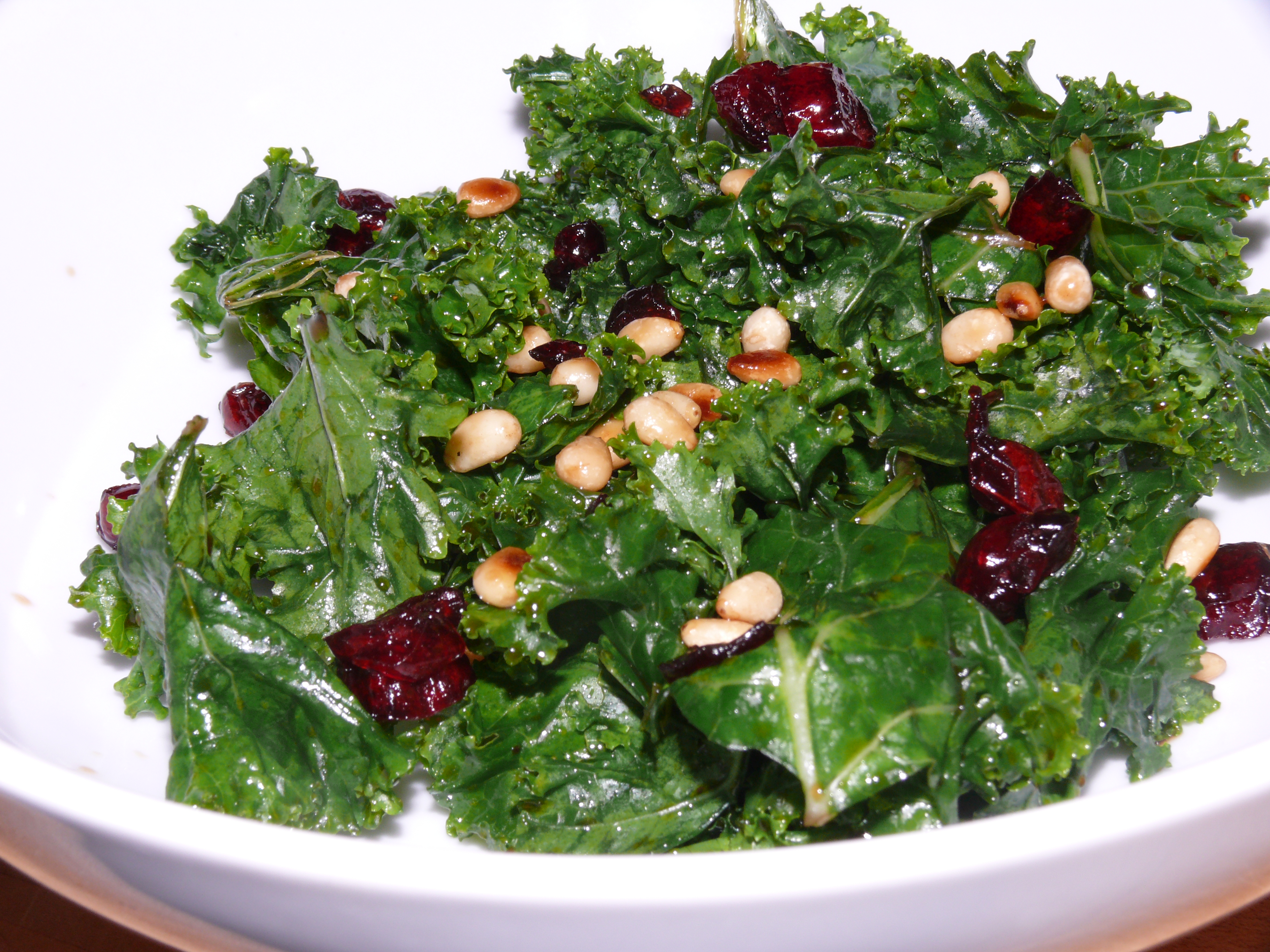 - Toss kale with dressing, then top with pine nuts and cranberries.