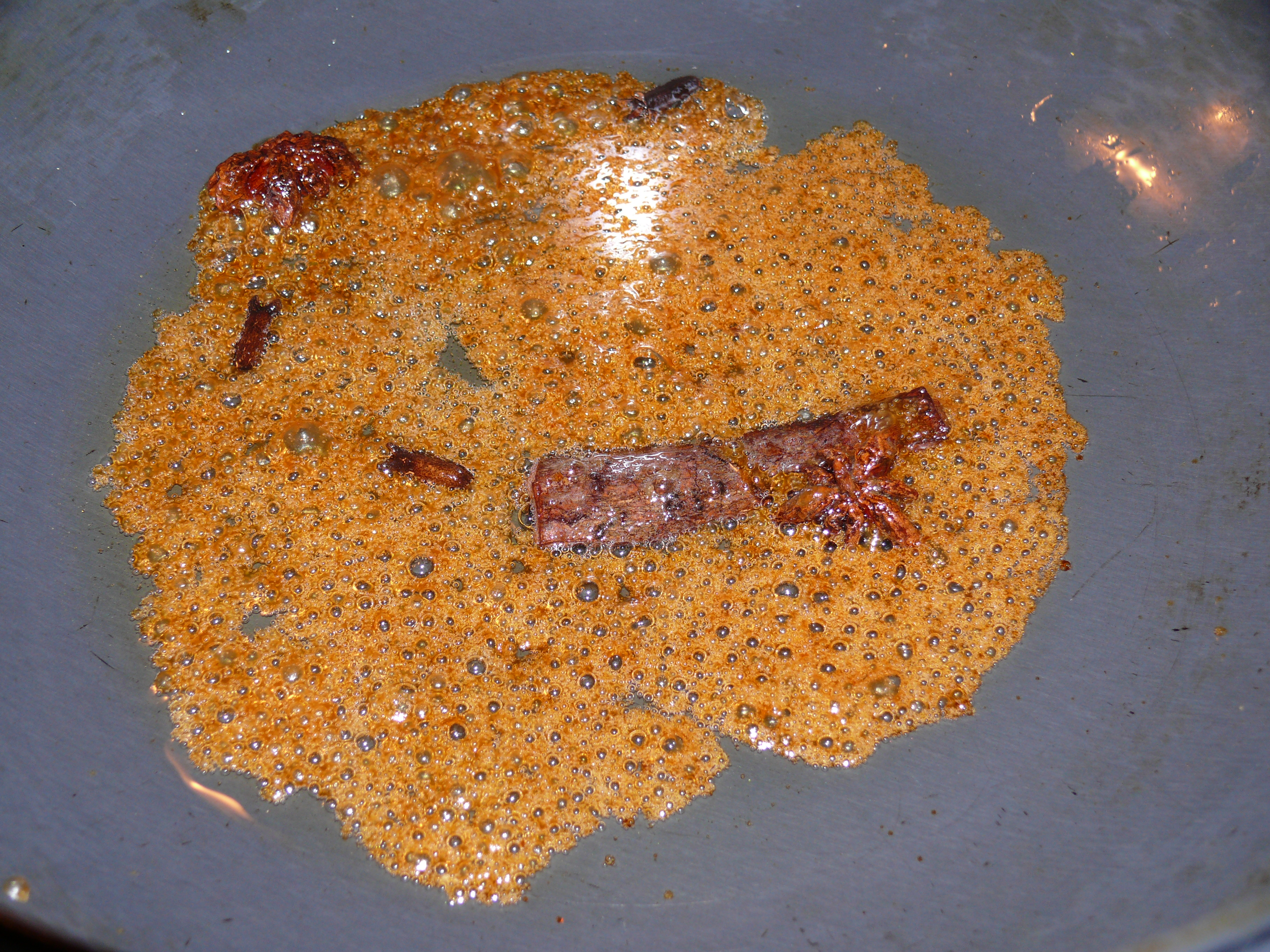 - Heat the ghee in medium sauce pan and add the star anise, cloves and cinnamon.