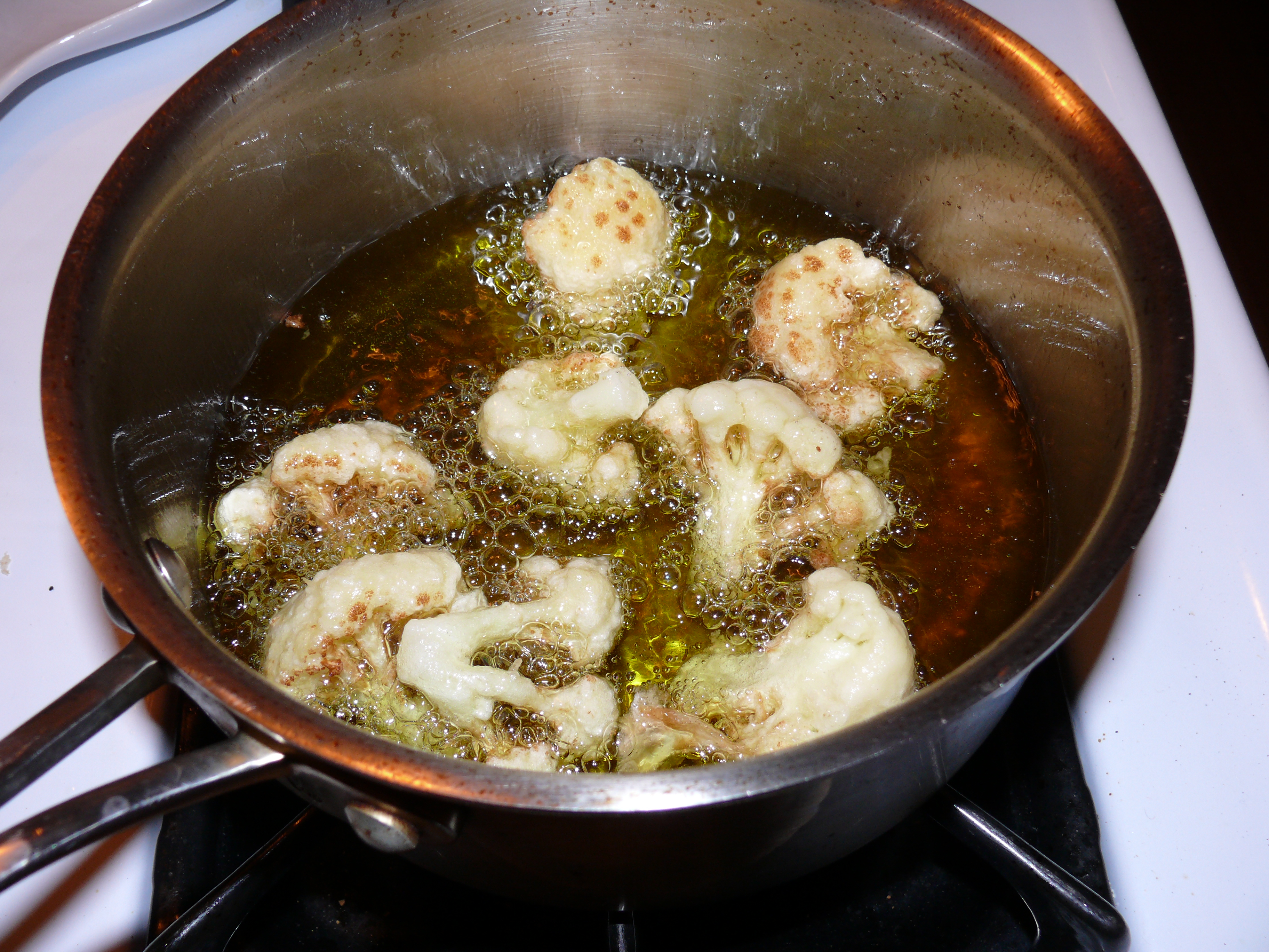 - Right before you’re ready to serve, heat oil for deep frying. Making sure each cauliflower is coated with batter, deep fry the florets until browned.
