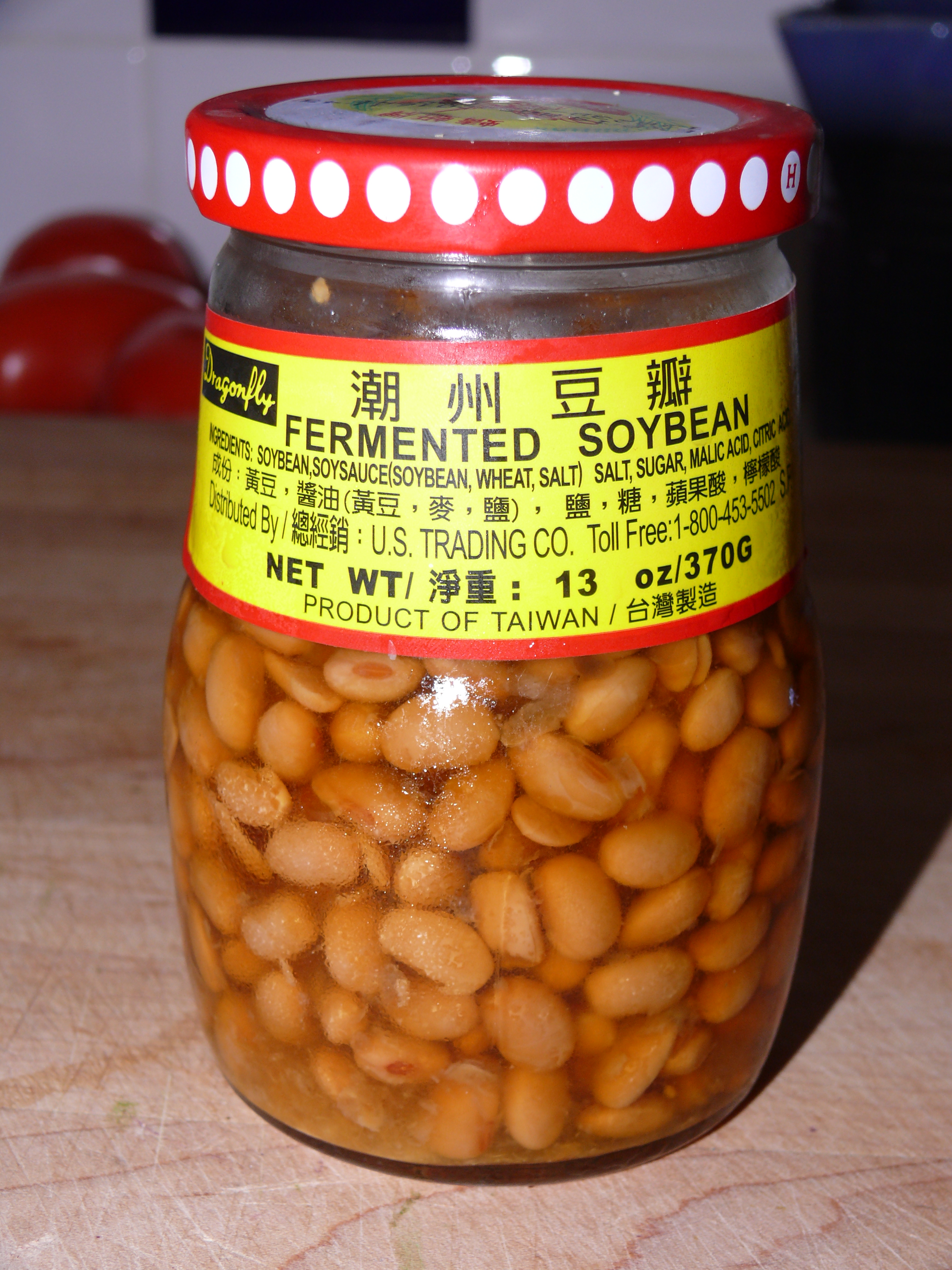 I used this recipe on Foodista, omitting the shrimp and shrimp paste and upping the amount of fermented soybeans. I was really impressed with the fermented soybeans I used. I have tried other types of fermented soy bean and soy bean pastes and they have all been especially “beany”. This had a really nice umami flavor without that taste I don’t like! Its a keeper! They didn’t have any fresh long red chilis at the Thai market, so I used samal oelek instead which is just chilis, salt and vinegar.