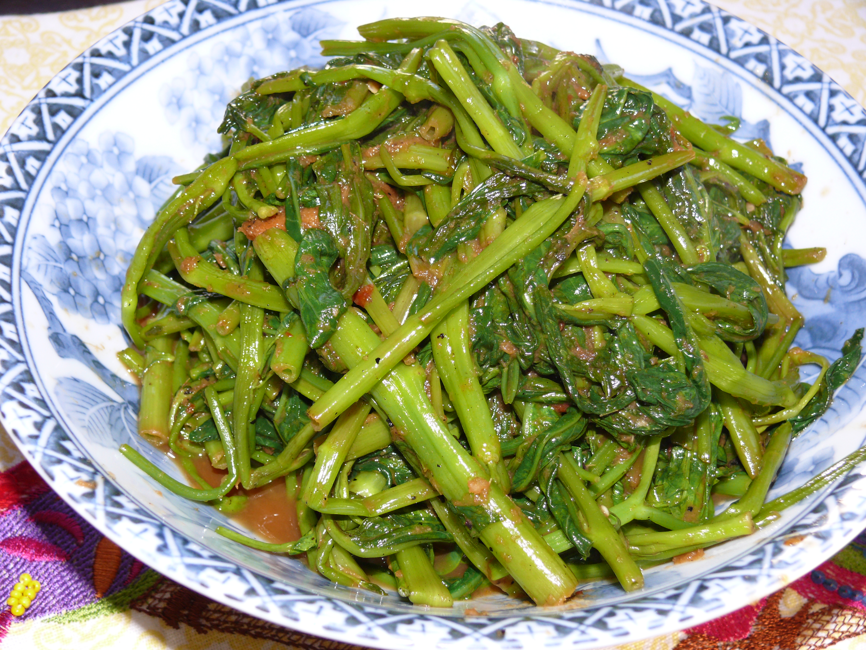 - Add the water spinach, stems first for a couple of minutes to get it wilted enough to add the leaves, then add the leaves. Throw in the tamarind paste and soy sauce and carefully stir until everything is wilted but the stems still slightly crunchy. At first it will seem like it doesn’t all fit, but after a little stirfrying it shrinks a lot!