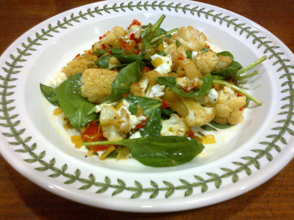 Warm Cauliflower Salad because salads really don’t get better than this. It is cold, but topped with warm honeyed cauliflower and dressed with mustard seed flavored sweet pickled onions and bell peppers.