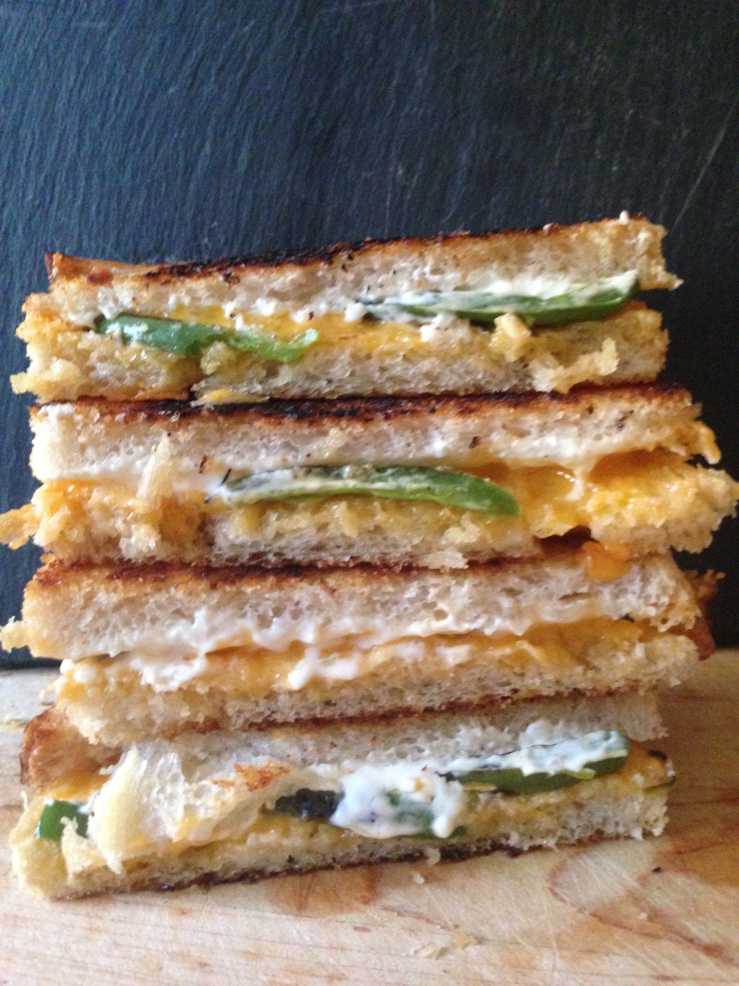 - Spread cream cheese on two slices of the bread. Top with the jalapenos, then the cheddar, then the other slices of bread.