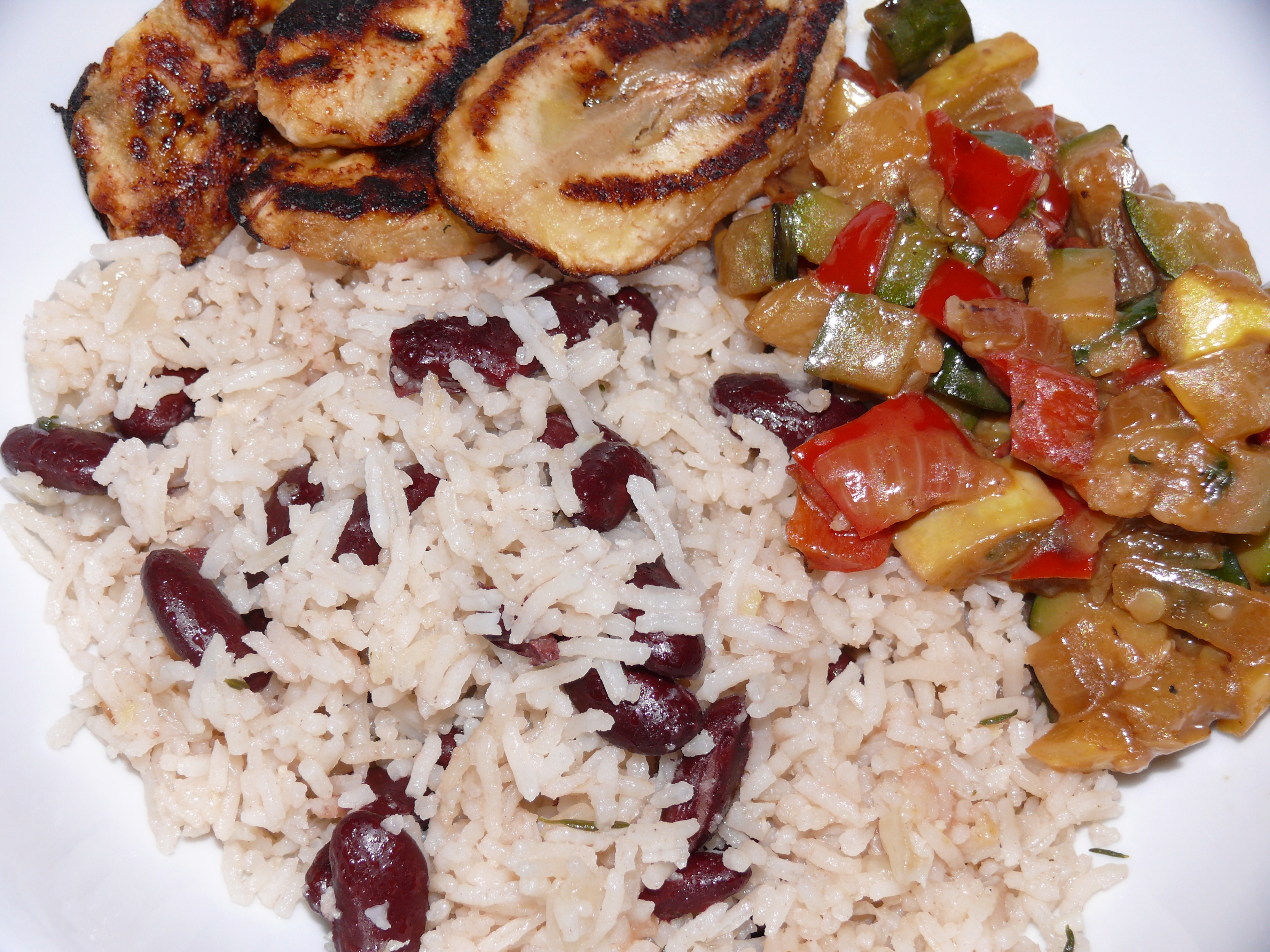 We had these Jamaican rice and peas with some sauteed vegetables (onion, red bell pepper, zucchini and yellow crookneck squash) cooked down in the rest of the can of coconut milk, fresh thyme and a little habanero, and sauteed plantains.