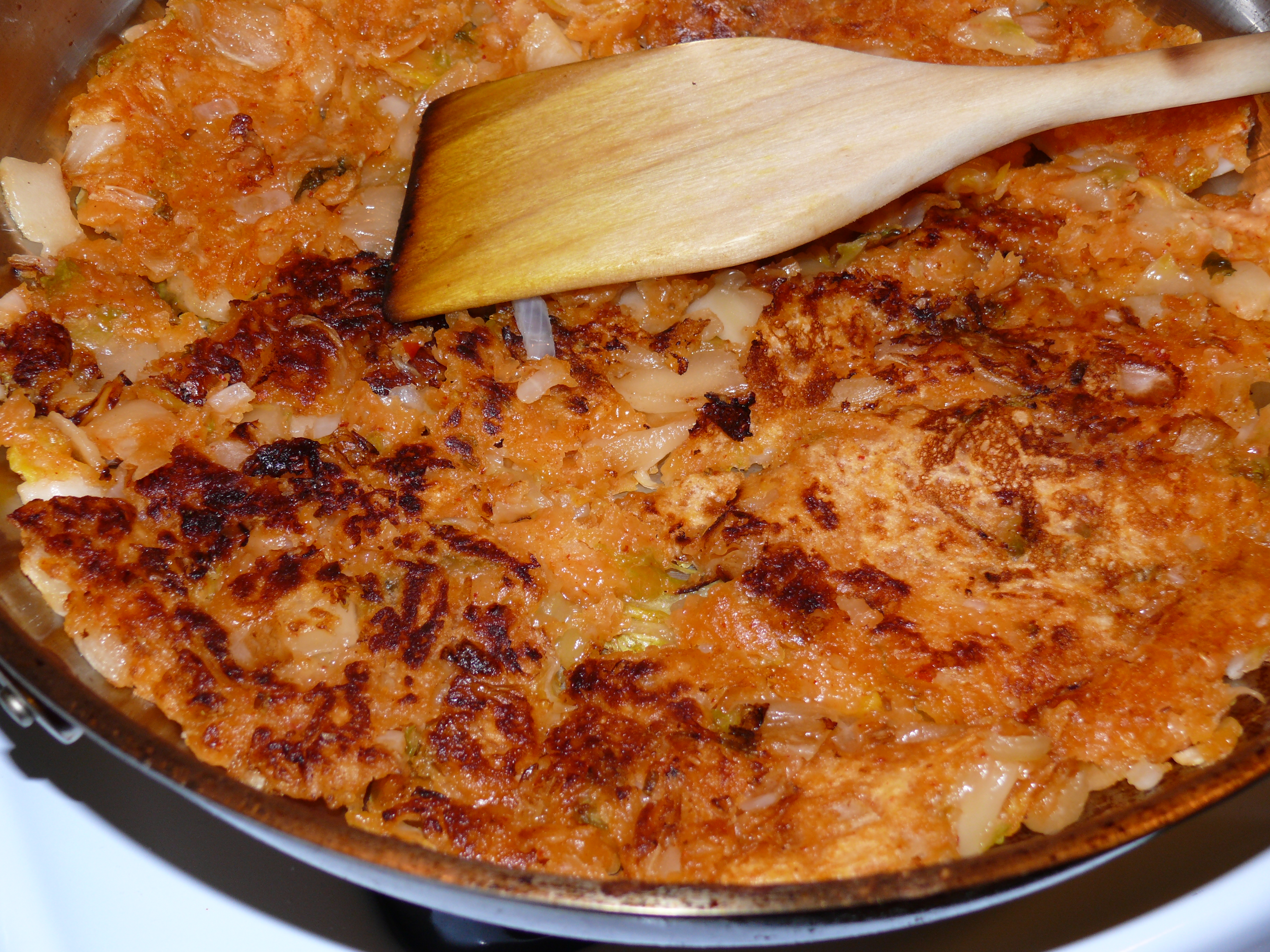I made a double recipe and tried to use just one big pan, but it was hard to get it thin enough. Next time I’ll split the batter in two and make two pancakes. I also couldn’t get it to stay in a nice round pancake!