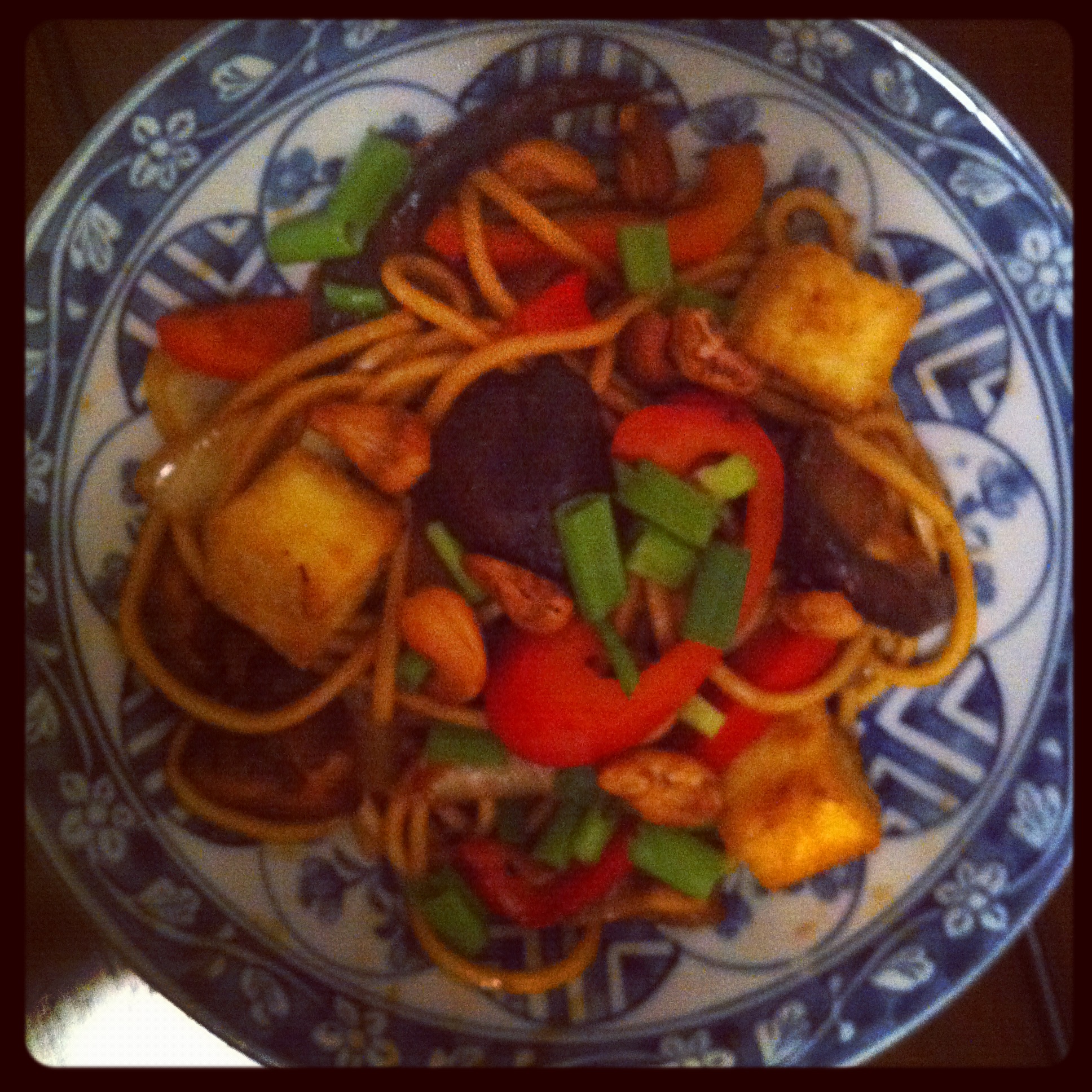 - Add back the bell peppers and onions, then the noodles, sauce, tofu, and cashews, and stir all together.