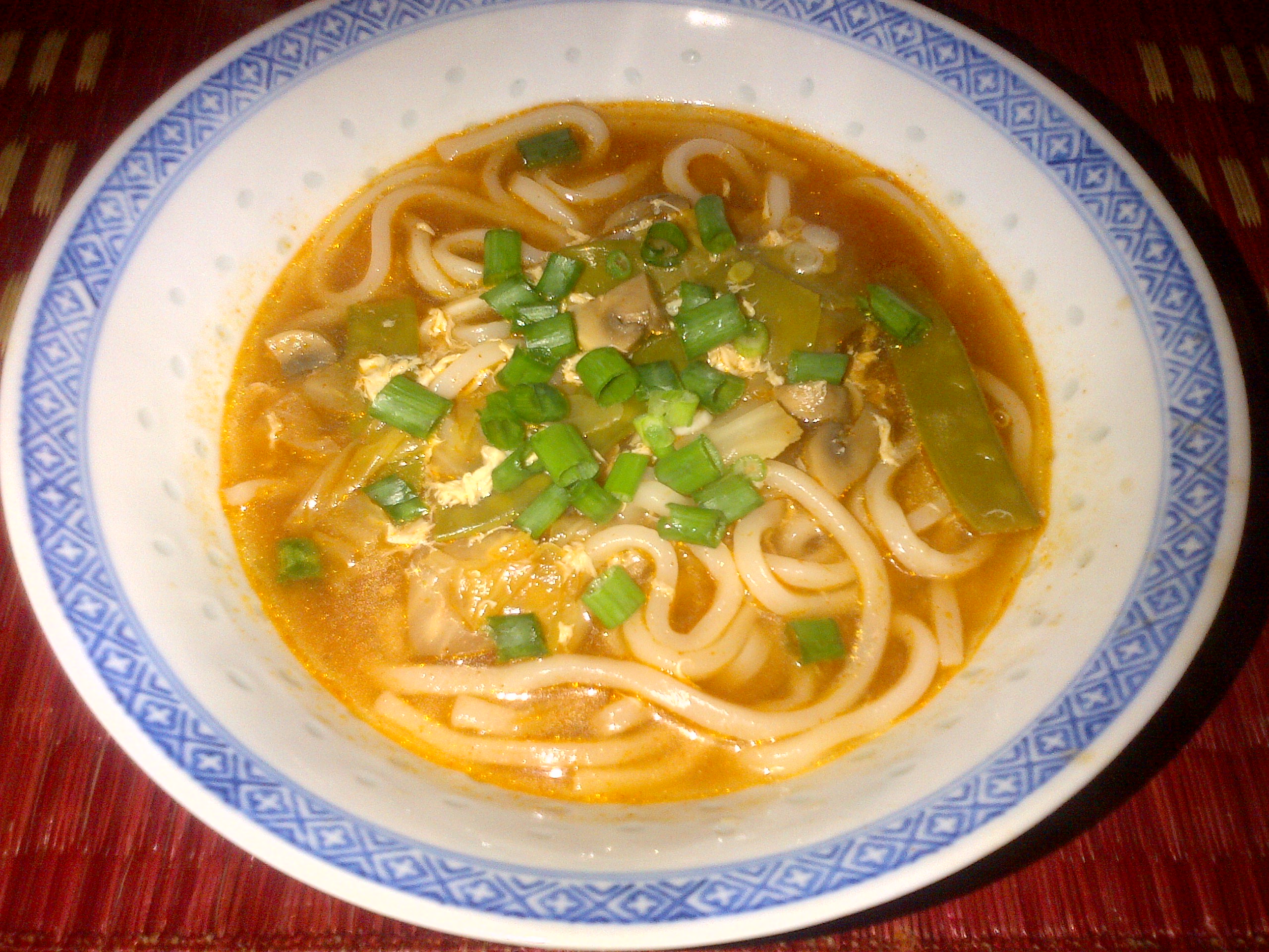 My first thought for tonight was for a simple chinese style soup. We had some cabbage and snow peas in there, and I picked up some mushrooms. Then Tejas asked if we could have noodles in there and I thought we had some thin chinese noodles, but nope, they must have been used up at some point. I really must get to 99 Ranch soon, there just isn’t one near us. What I did find in the freezer was a package of udon that I gotten at a Korean market a while back. I love Korean food, but have had so little of it (kimchi pancakes mmmmmm), and I tried to make a few things a while back but didn’t have the best luck. The good thing is I had just what I needed to make a version of this simple Korean soup I found online!