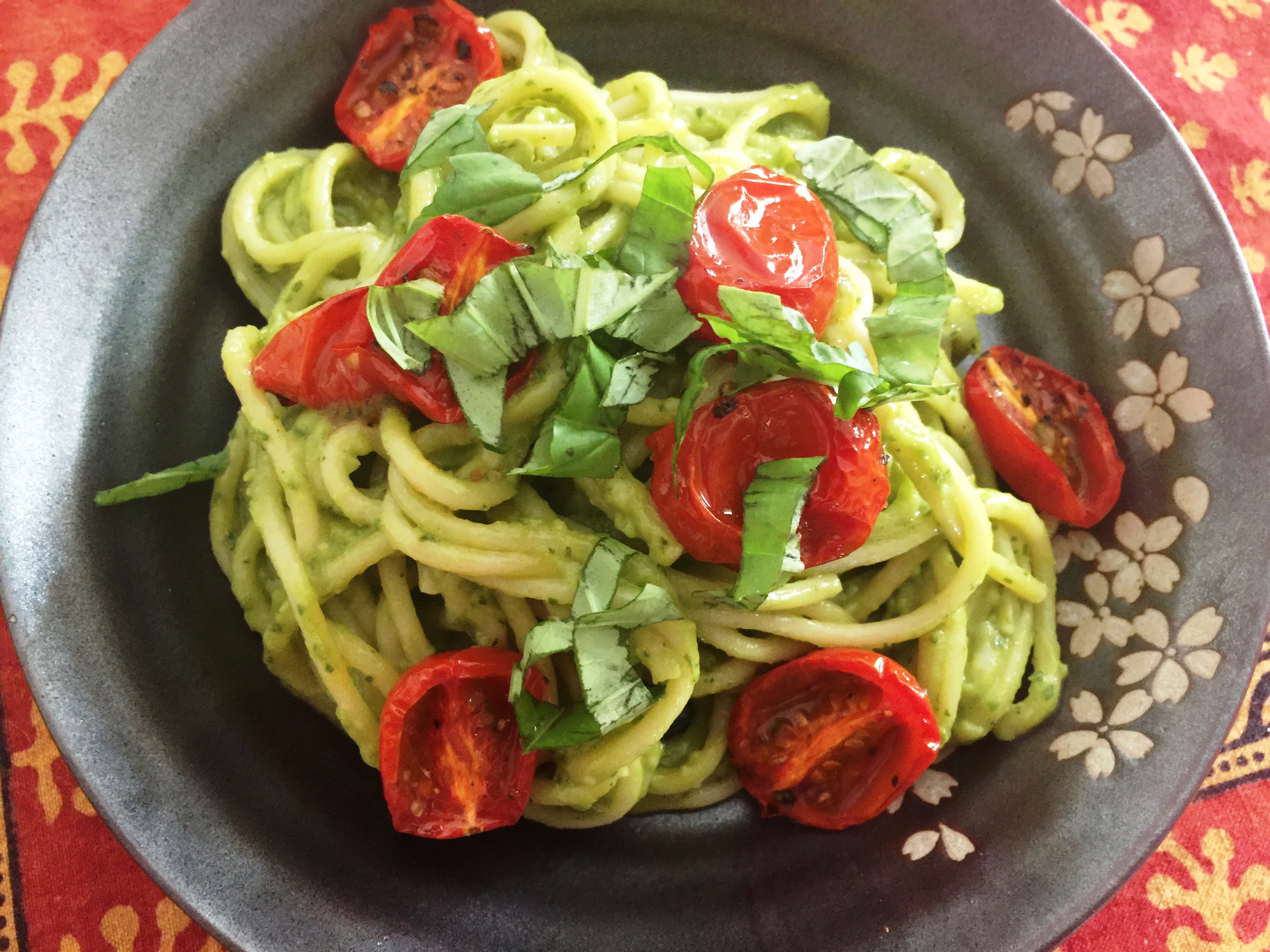 - Toss the spaghetti with the avocado sauce and top with roasted tomatoes and maybe even some toasted pine nuts. Ooo la la.