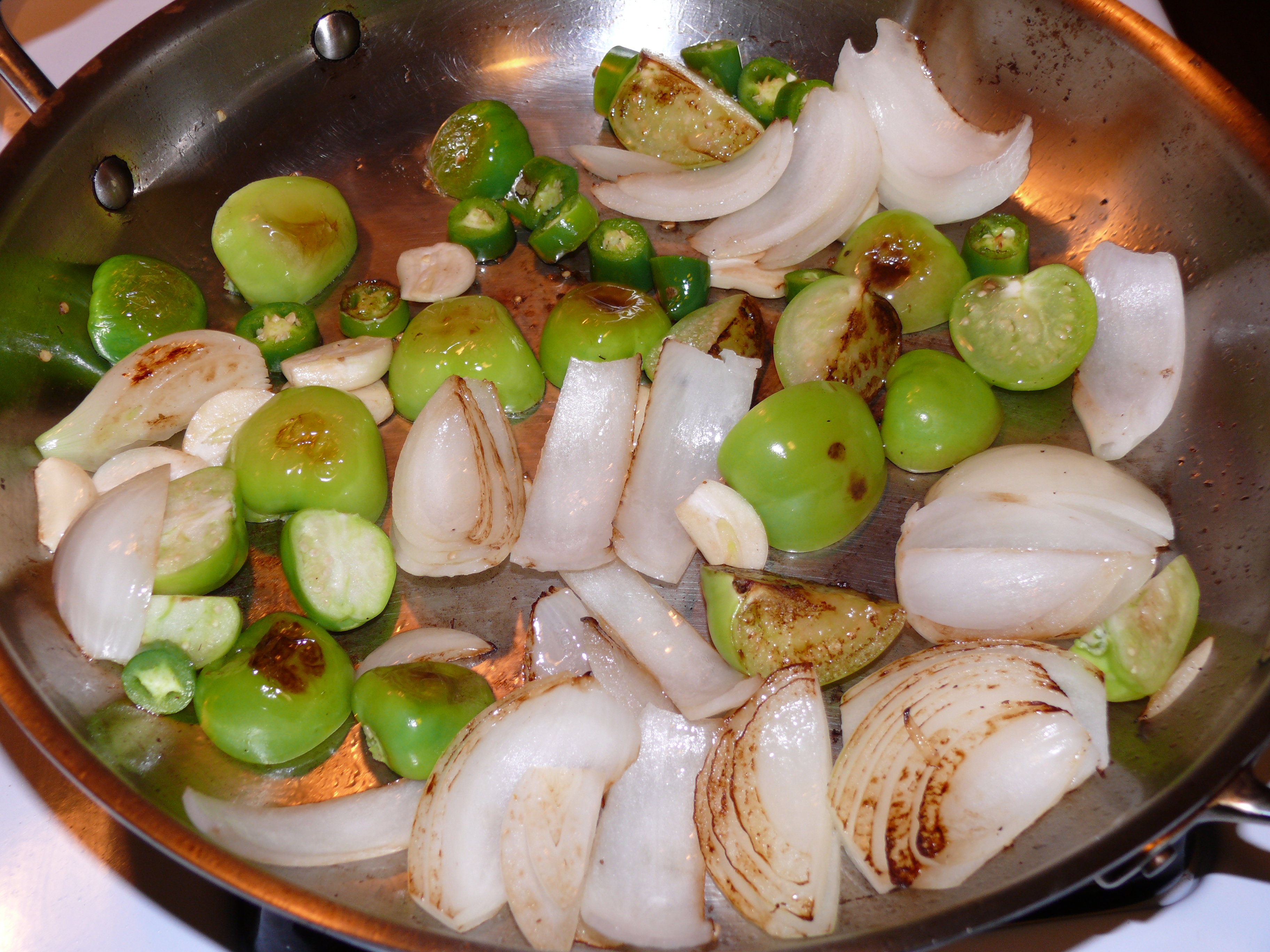 - Add oil to the same skillet, up the fire to medium high and throw in the onions, tomatillos, garlic, and serrano peppers. Cook for 6-7 minutes, only stirring a couple of times. You want a little bit of nice browned char. Add to the food processor or grinder along with the water, cilantro and salt, and process until smooth.