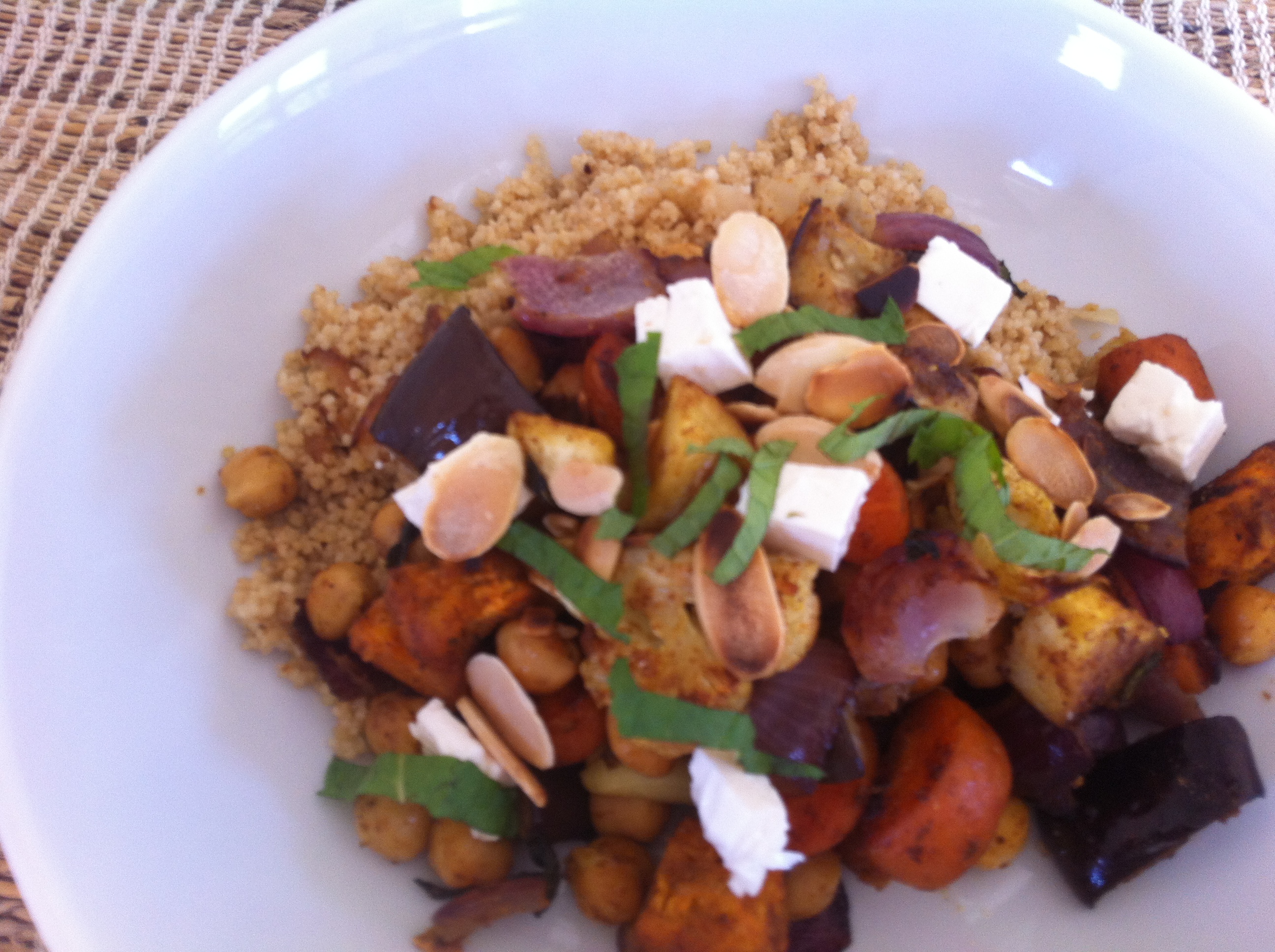 A few months ago I ran across a Moroccan spice mix called rasel hanout and decided to order it based on fantastic reviews on Amazon. The spice mix apparently has over 35 ingredients! I finally opened it up to make Moroccan spiced roasted vegetables to go over whole wheat cous cous and WOW. I used a mixture of carrots, parsnips, sweet potatoes, eggplant, cauliflower, and red onions, and threw in some chick peas. Topped with feta cheese, toasted sliced almonds, raisins, and fresh mint, the dish turned out amazing!