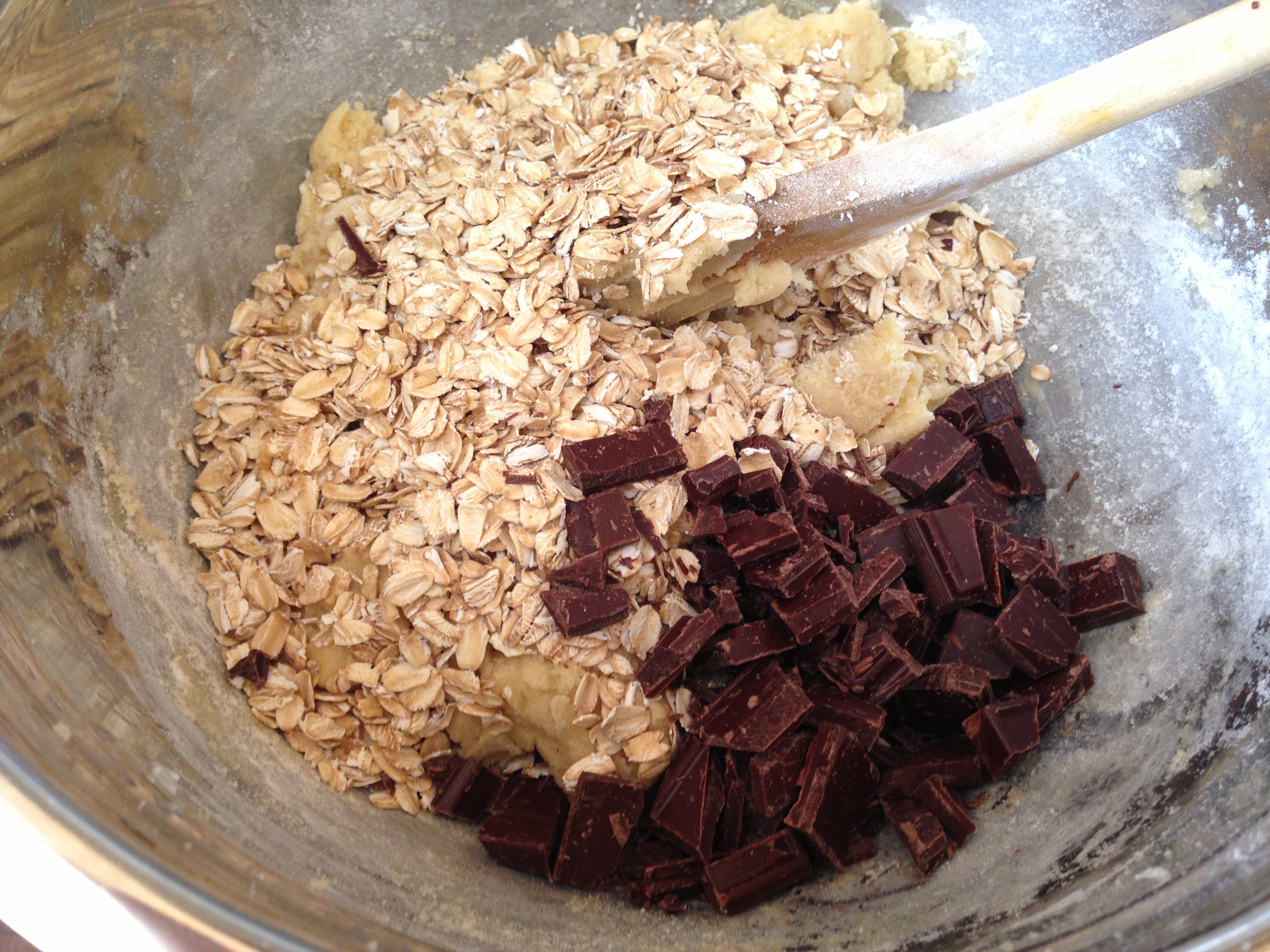 - Add the oats and chocolate and combine. I found that using my hands worked best for this.