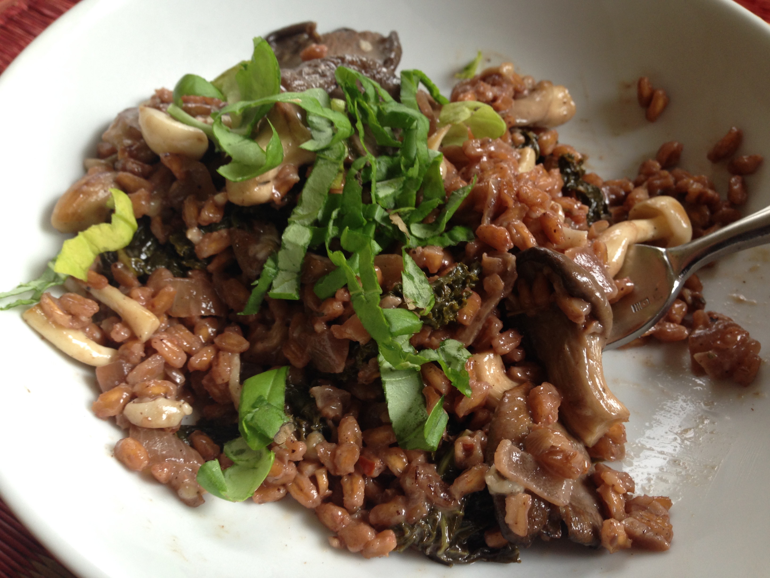 Ever since I made Smitten Kitchen’s amazing tomato farro, I’ve been wanting to try farro again but with mushrooms. I recently bought a bunch of mushroom from the Asian market and realized this was my chance to make mushroom farro risotto. I threw in a little kale too! My recipe is inspired by this one on Spoon Fork Bacon, but it is pretty different.