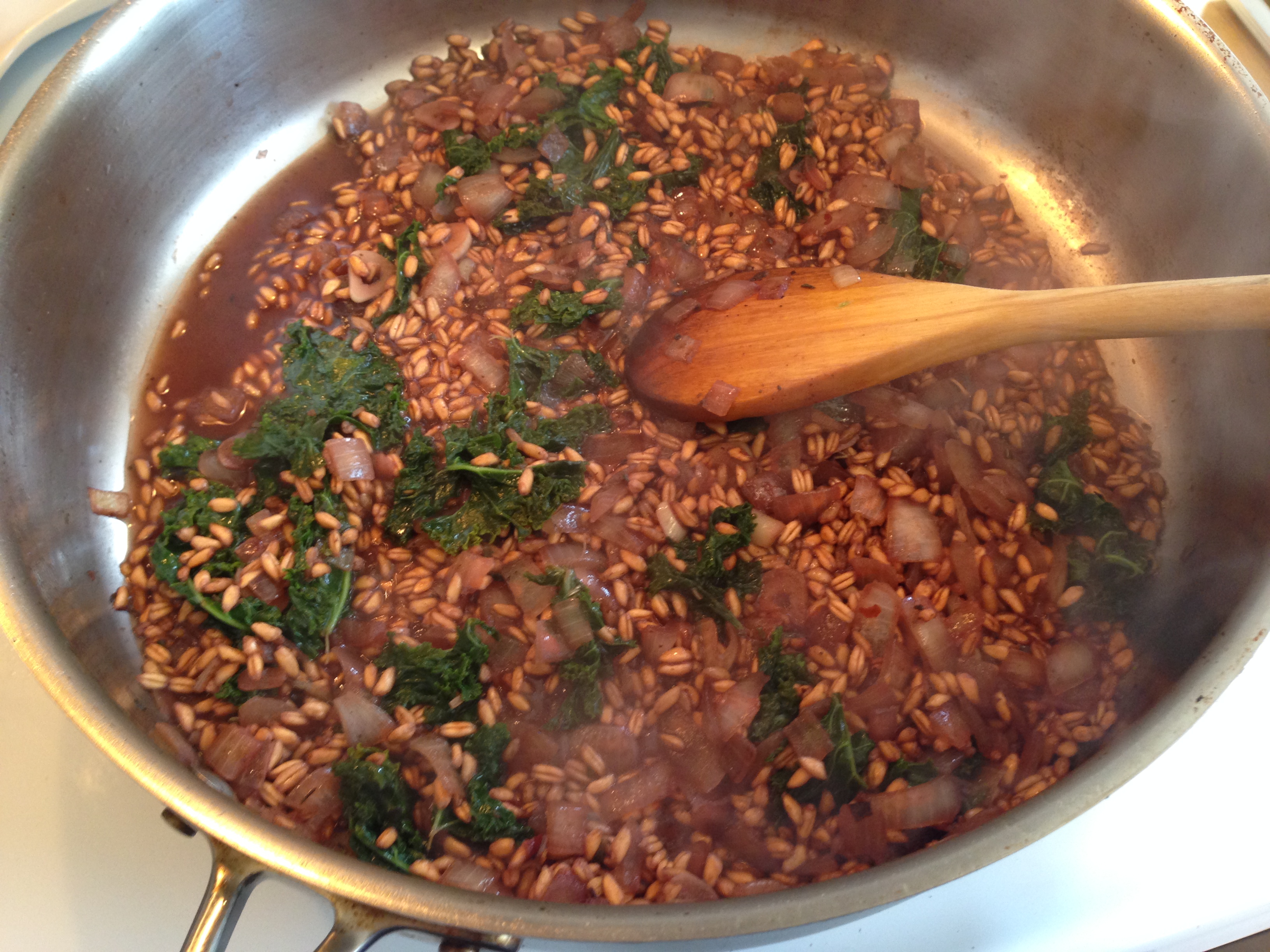 3. Meanwhile, heat the olive oil and more butter in the same skillet over medium heat. Saute the onions and garlic until browned.  Add the farro and toast a little. Add the red wine and cook until evaporated. Add in the kale and dried herbs. Add a cup of vegetable broth and cook stirring occasionally until the liquid has evaporated. Continue adding broth one cup at a time until the farro is tender but still chewy. I needed 6 cups!