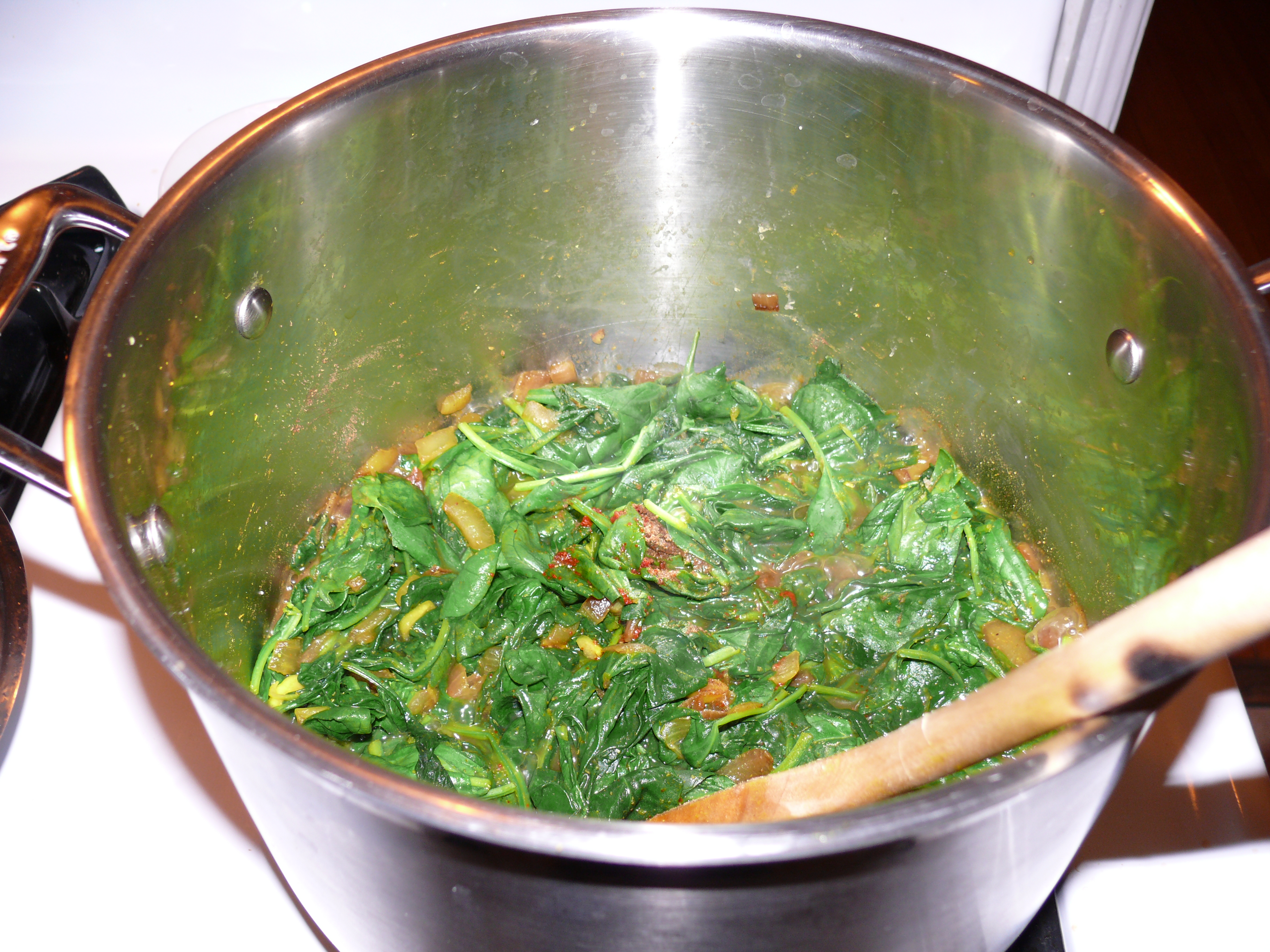 - Add spinach and a little water and cook down until the spinach is all mushy.