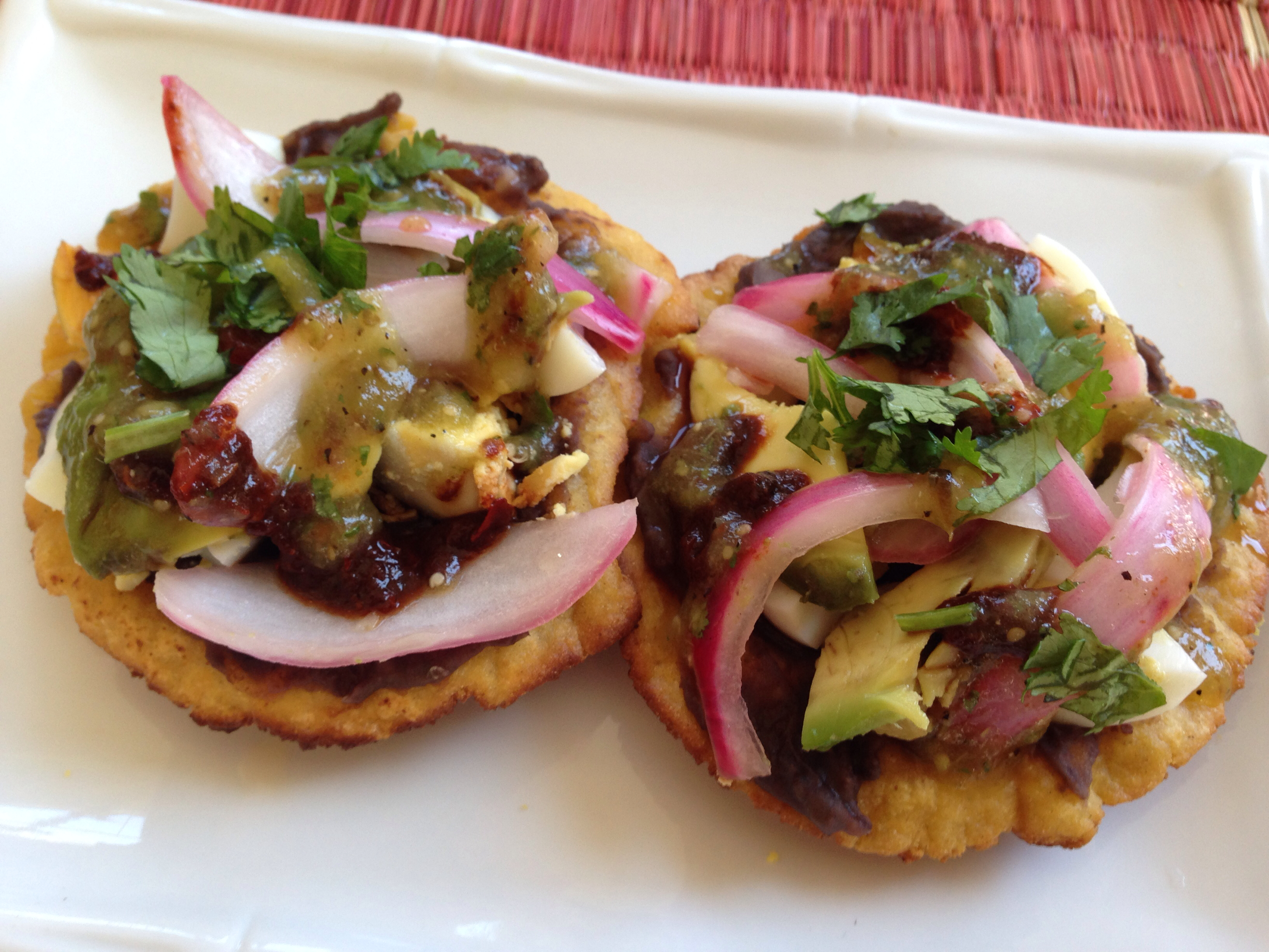 Panuchos and salbutes were our favorite meal when we went to Merida, Mexico over the summer. Fried corn tortillas topped with eggs and pickled onions, and sometimes black beans and/or avocados. Then you drizzle on this super spicy green salsa. Oh my! I am not quite sure the difference between the two, but from what I read somewhere, the tortilla base is first cooked then fried for panuchos but the dough is only fried for salbutes. Regardless if I got this right, they are both delicious!
