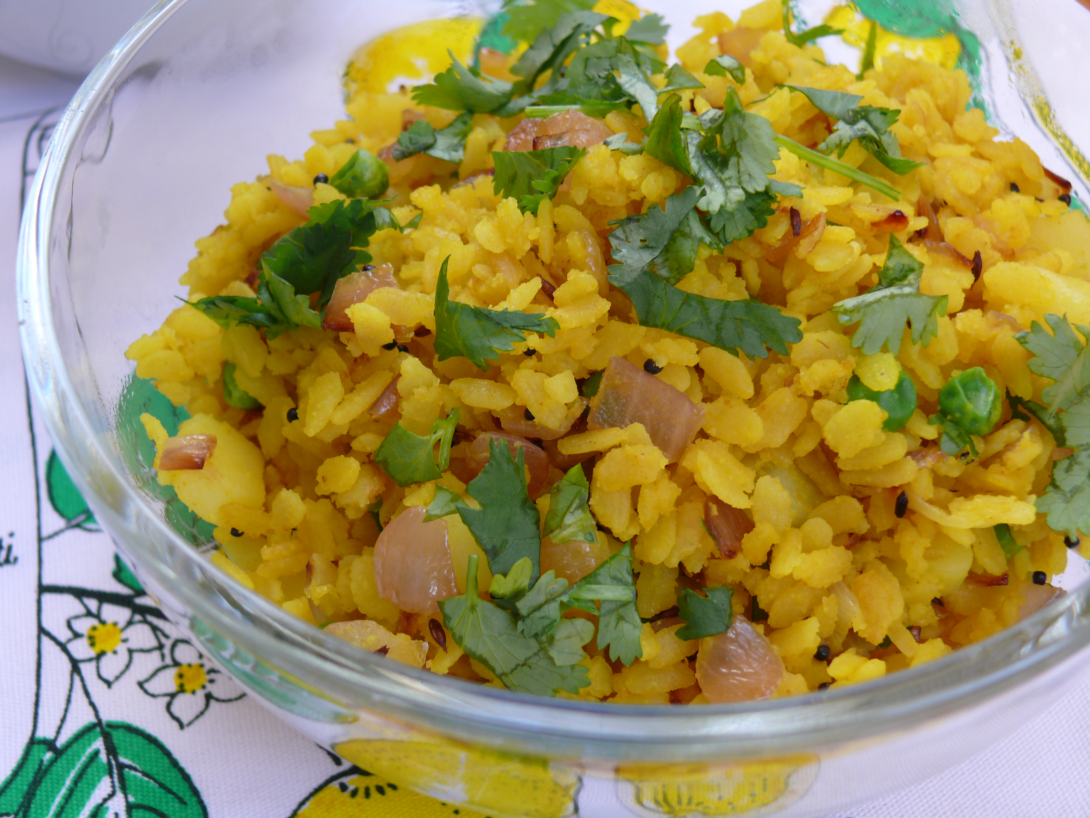 - Add the drained poha, potatoes, peas, turmeric, sugar, salt and lemon juice, and stir. Sprinkle with cilantro.