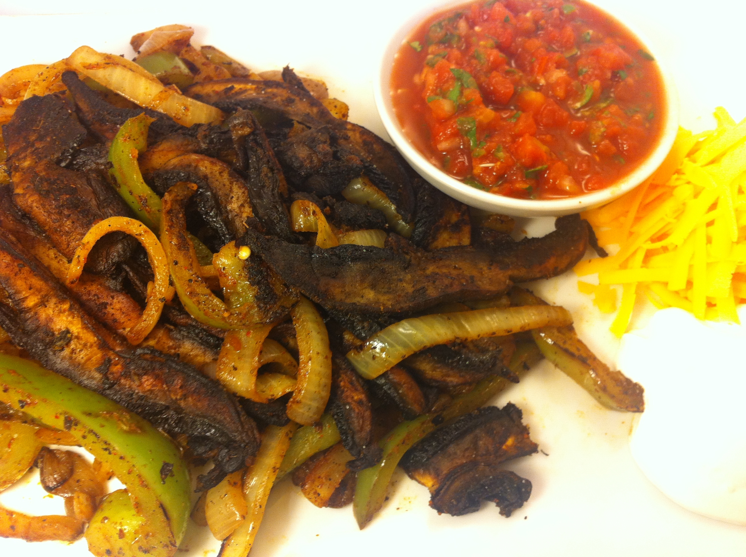 - Add portobello mushrooms, onion and peppers, a little cheese, tomato salsa, and sour cream.