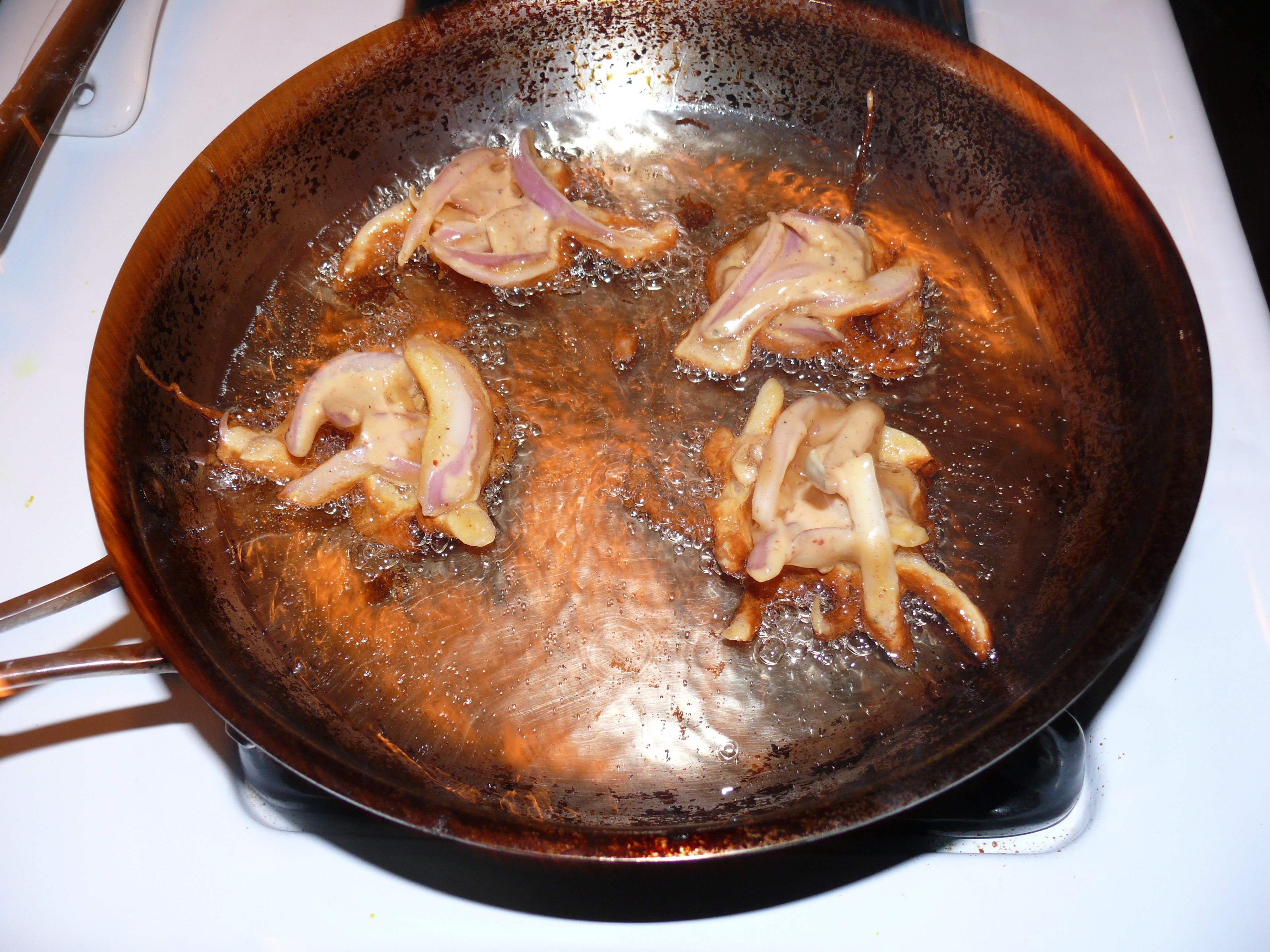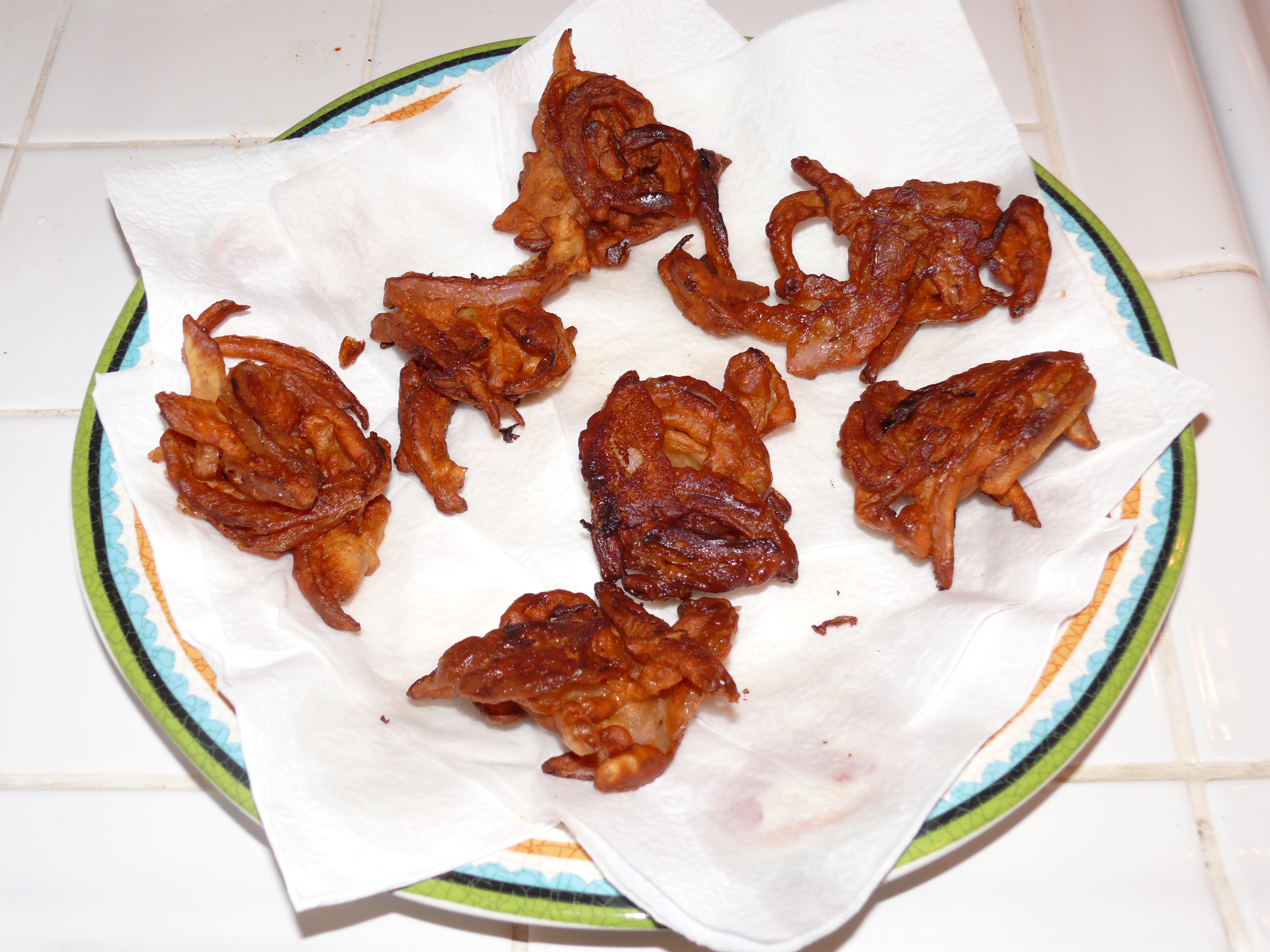 - Heat frying oil in a small skillet. Shallow fry the pakoras, turning over once brown on the first side. Drain on paper towels.