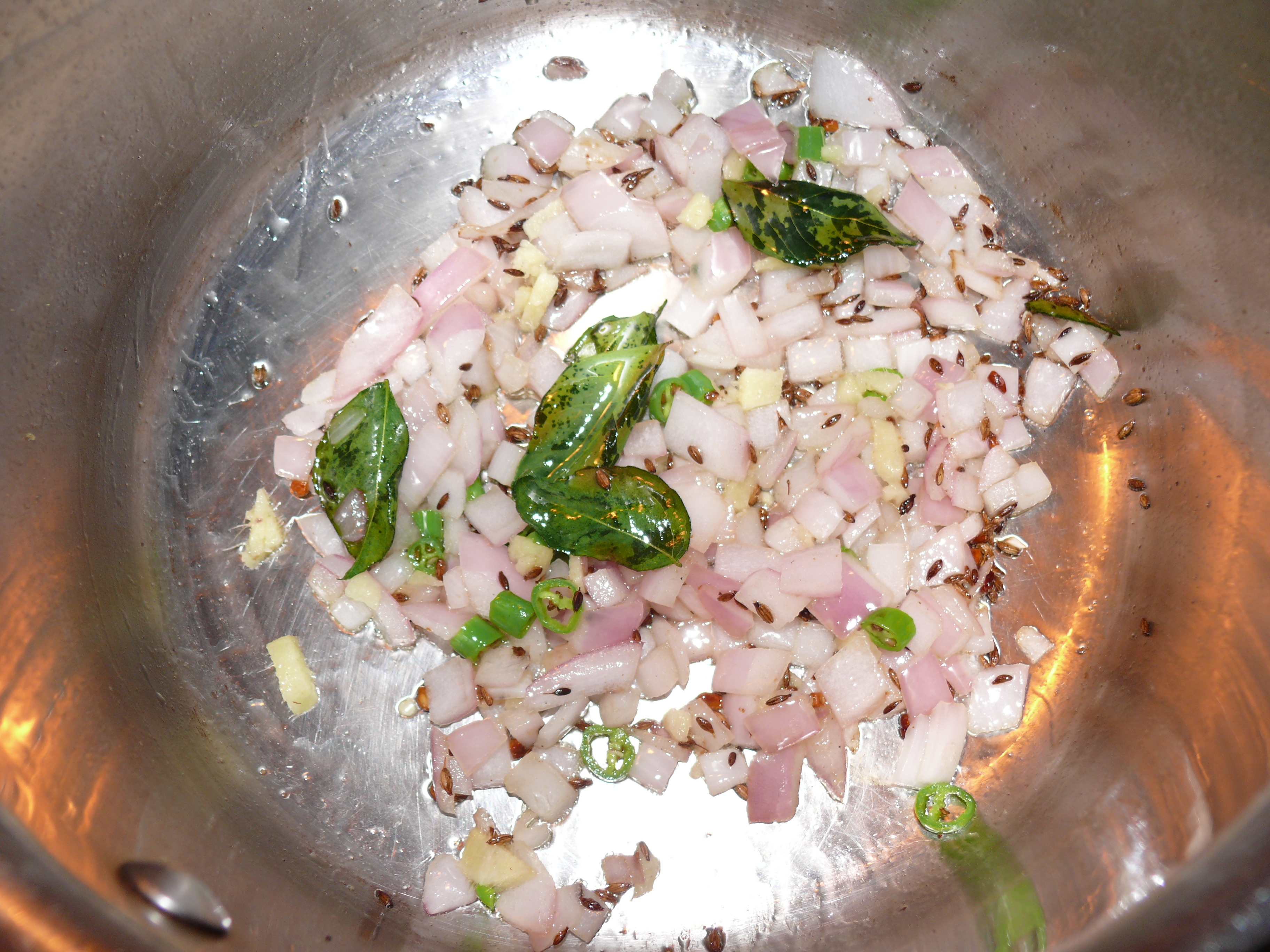 - In a sauce pan heat the olive oil. Add the cumin seeds and fry for a couple of seconds. Add the fenugreek seeds and toast until the cumin is brown and fragrant. Add the curry leaves and hing and cook for another few seconds.