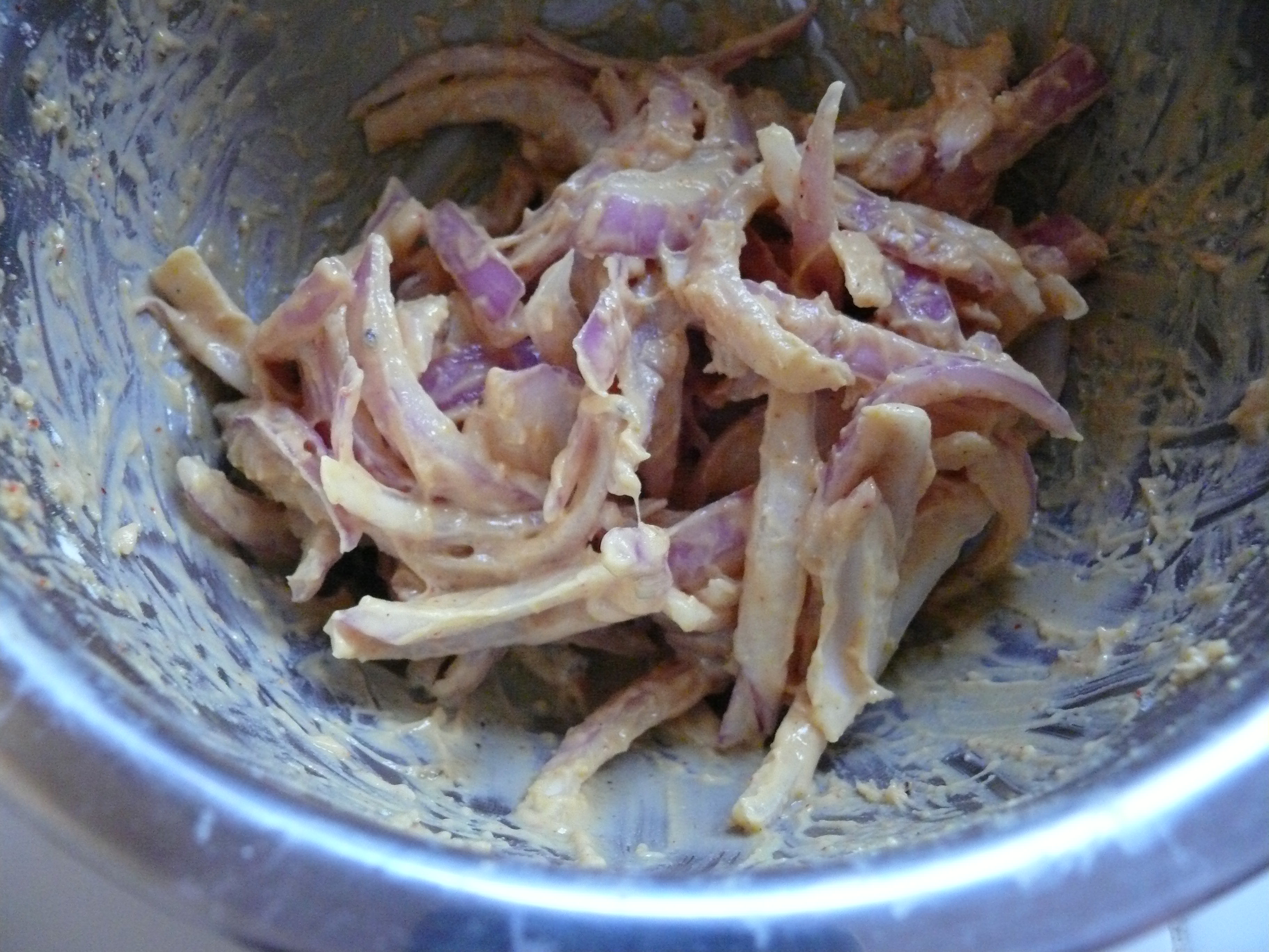- With your hand, mix onions with besan flour, ajwain, red chili powder, garam masala, a little salt and the water. Set aside for about 20-30 minutes (while you make the kadhi).