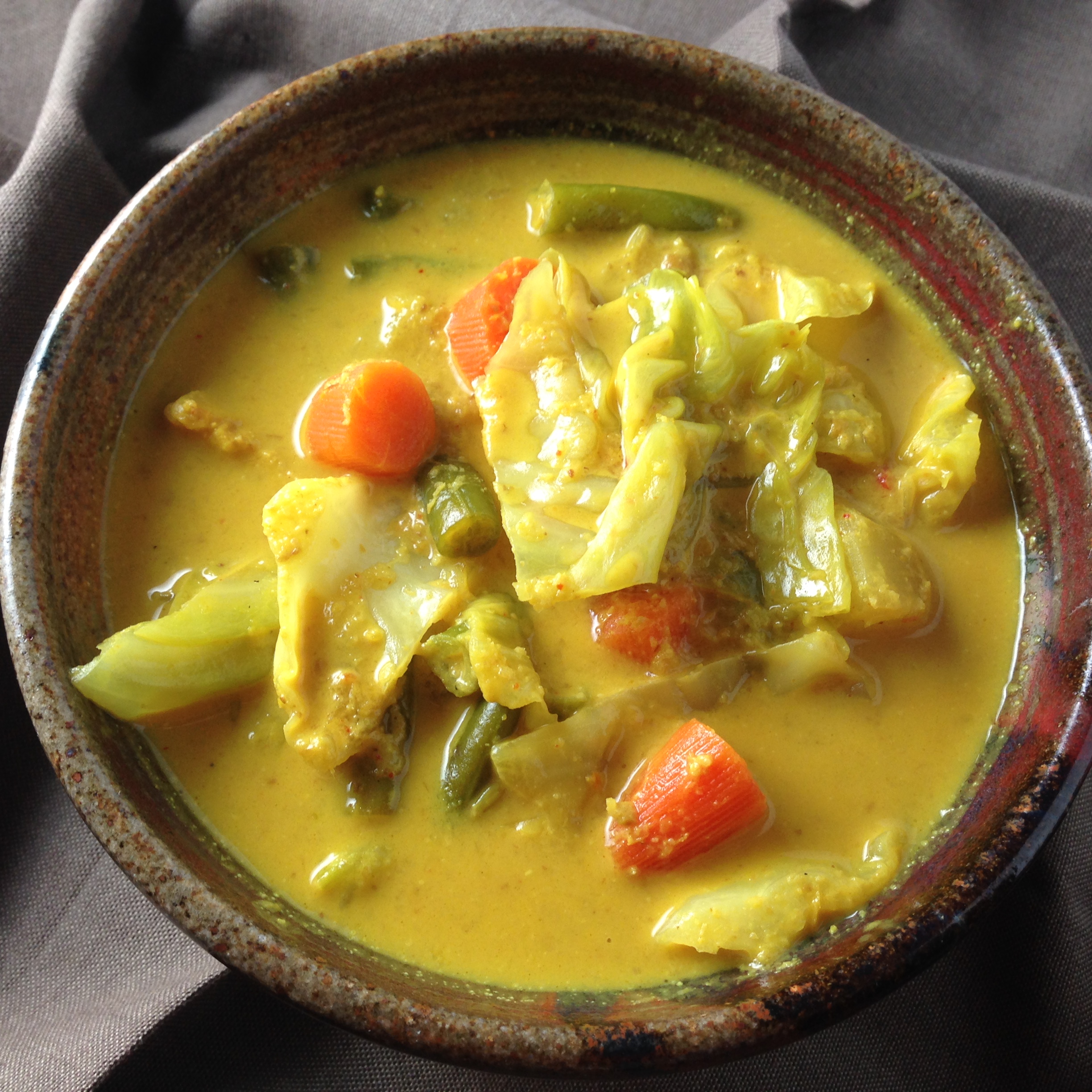 - To the paste, add the turmeric, chili powder, potato, carrots, water and salt. Cook for a few minutes, then add the green beans. Once the potatoes, carrots and green beans are almost cooked, add the cabbage and coconut milk. Add any water or salt if needed, cook until the cabbage is wilted, and serve.