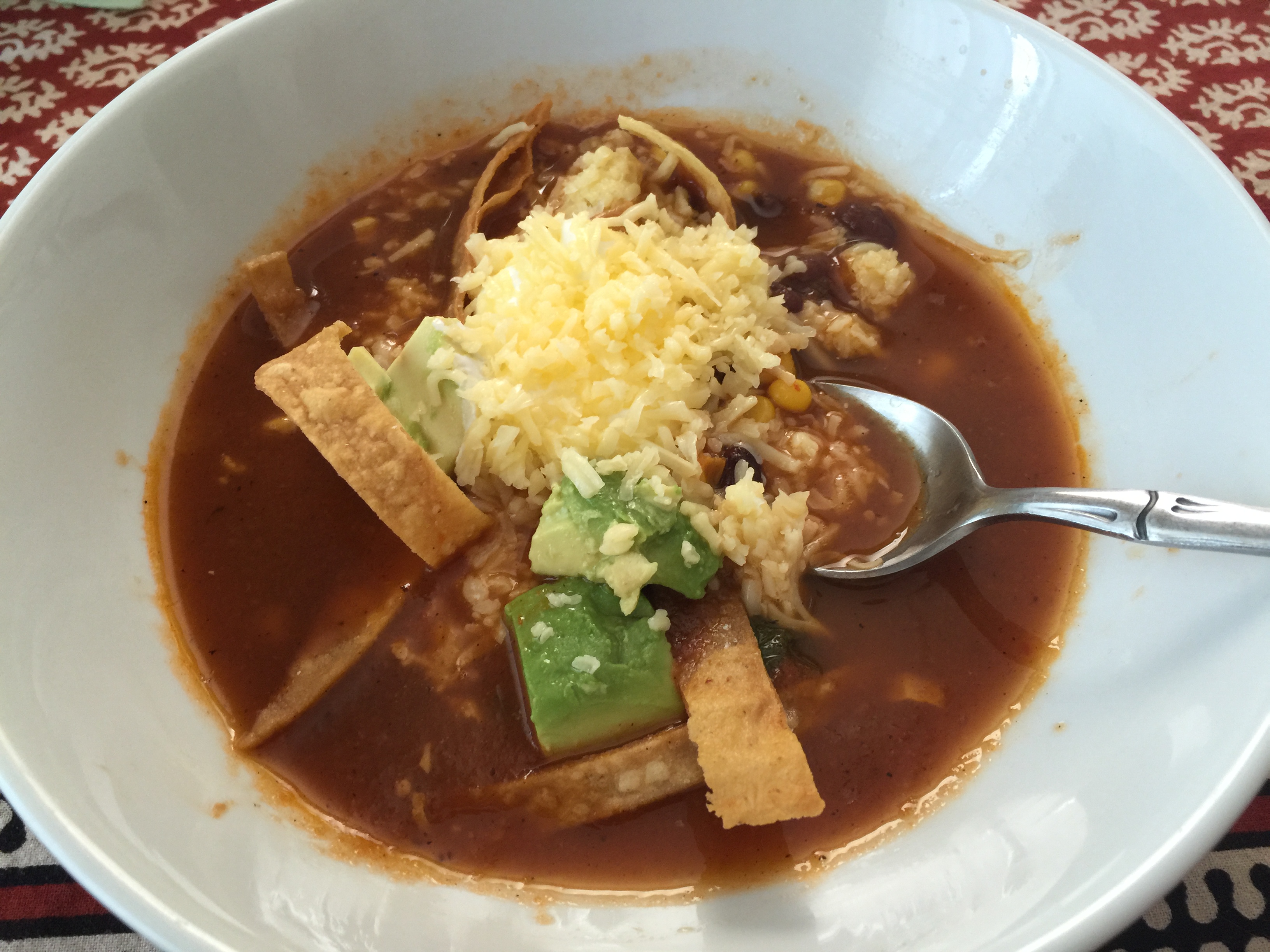 - Serve the soup in bowls and squeeze with lemon and top with avocado, sour cream, tortilla strips and cheese!