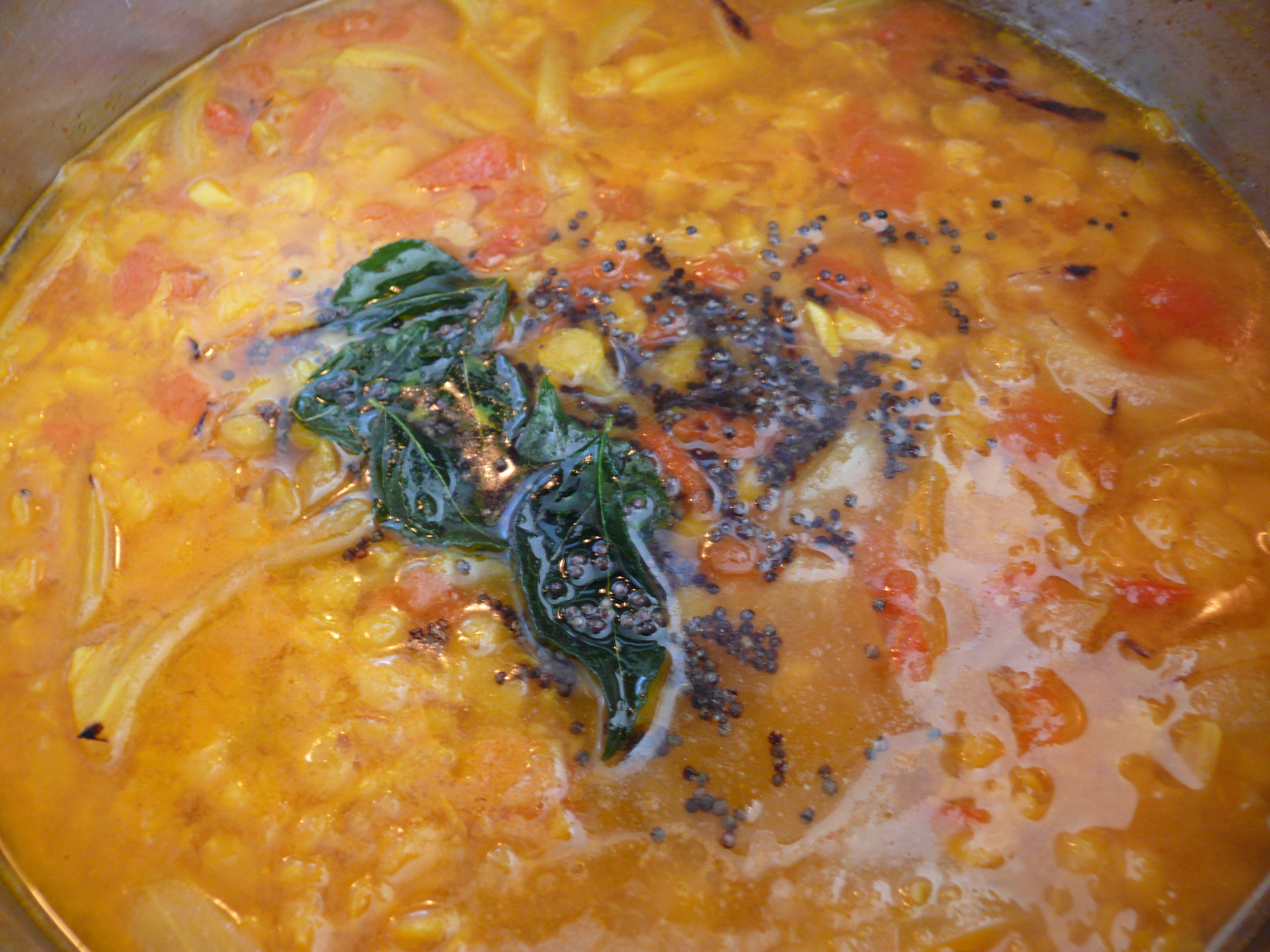 Step 11: Throw the mustard seed and curry leaves into the dal and add salt