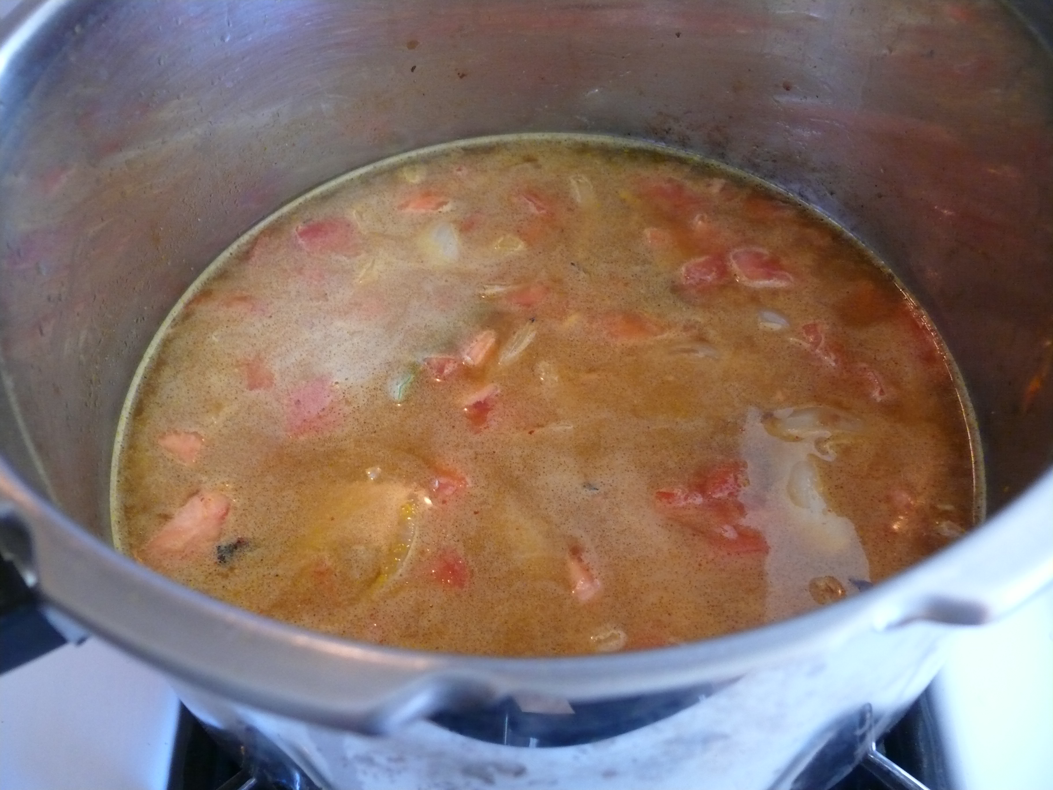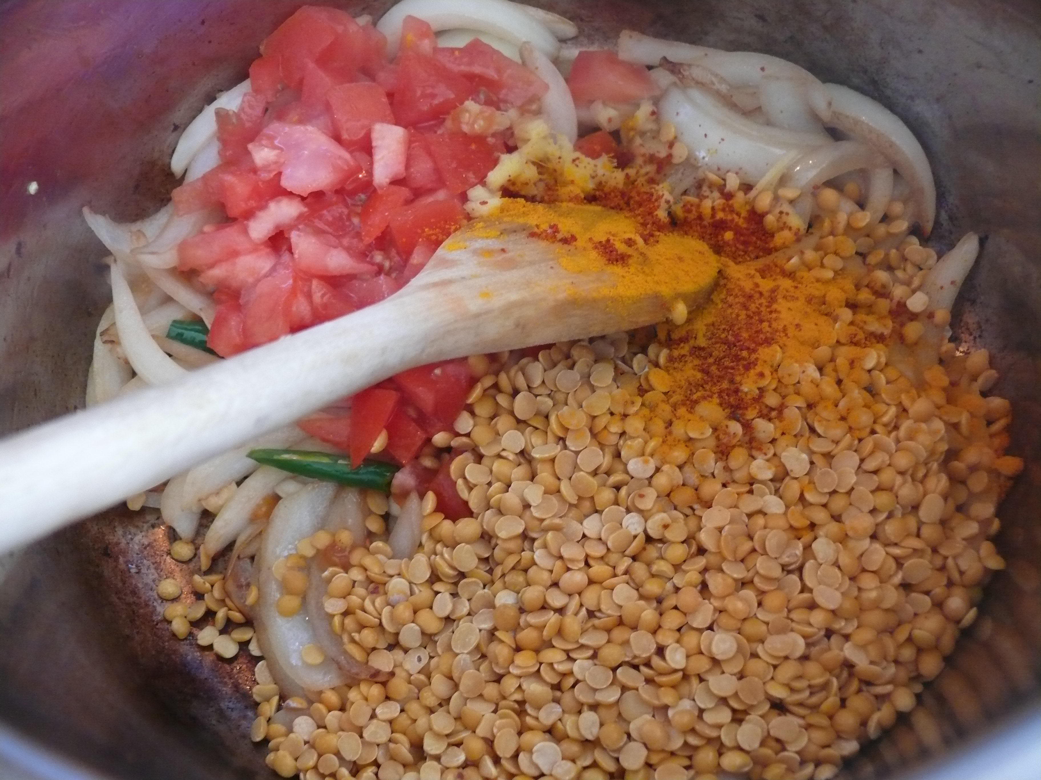 Step 6: After a couple of more minutes, add tomatoes, turmeric, chili powder, and toor dal