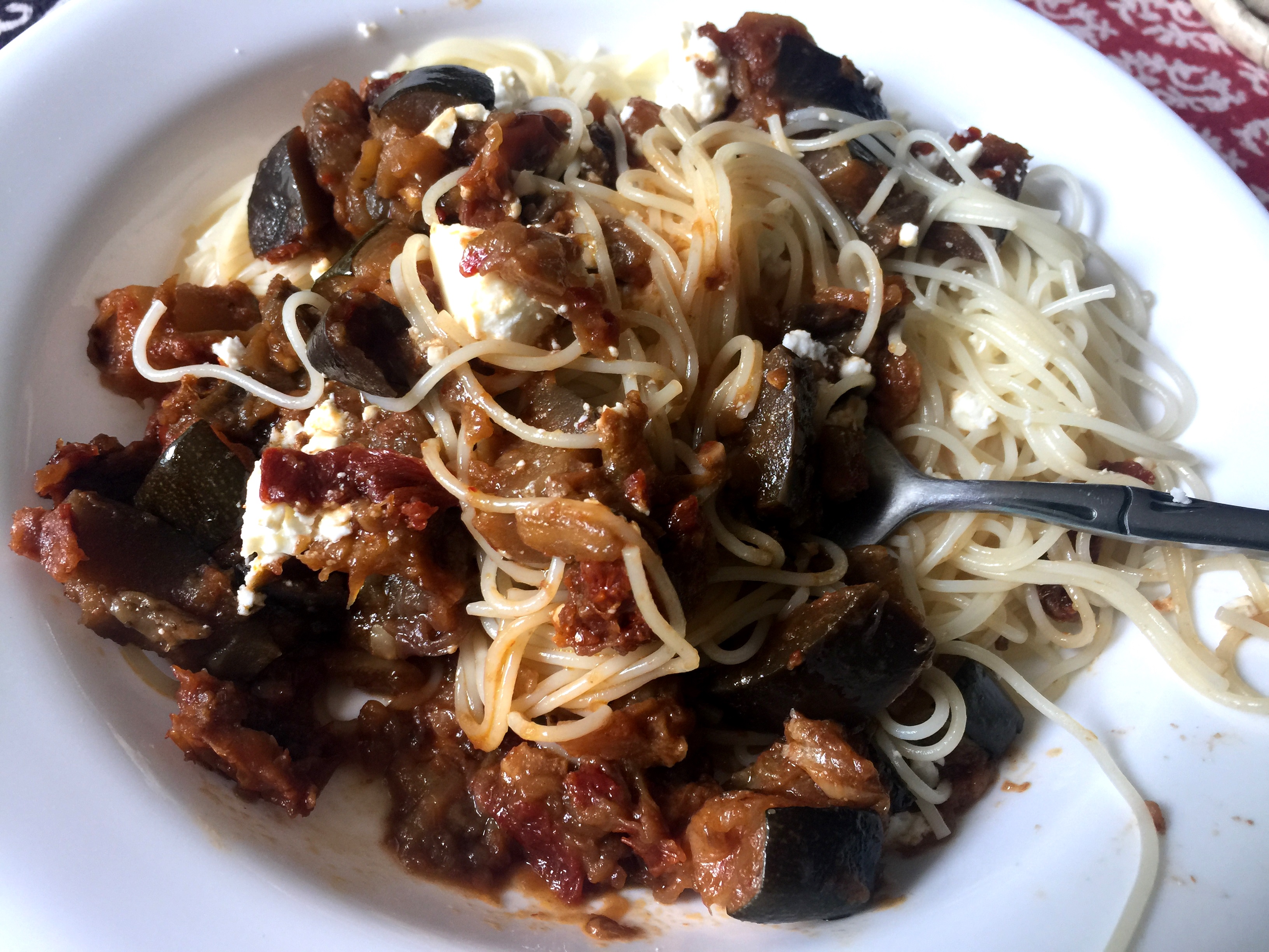 - Top cappellini with eggplant and zucchini mixture, then top with feta cheese.