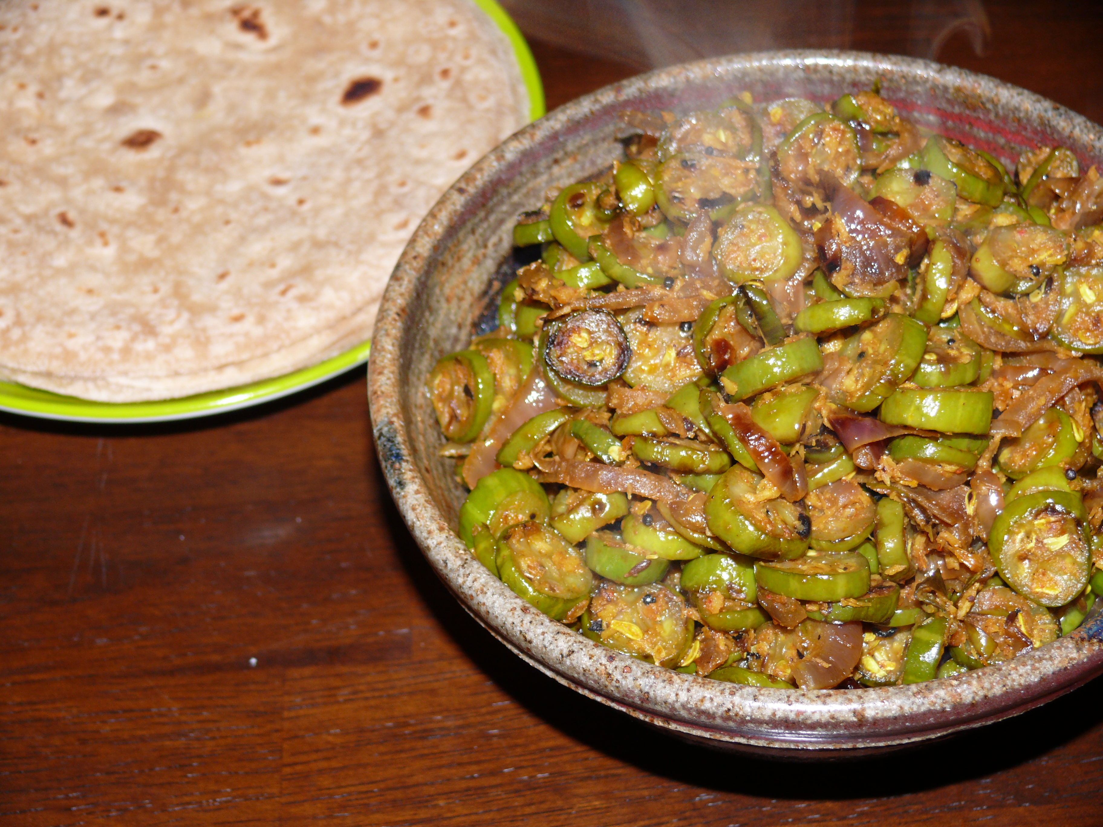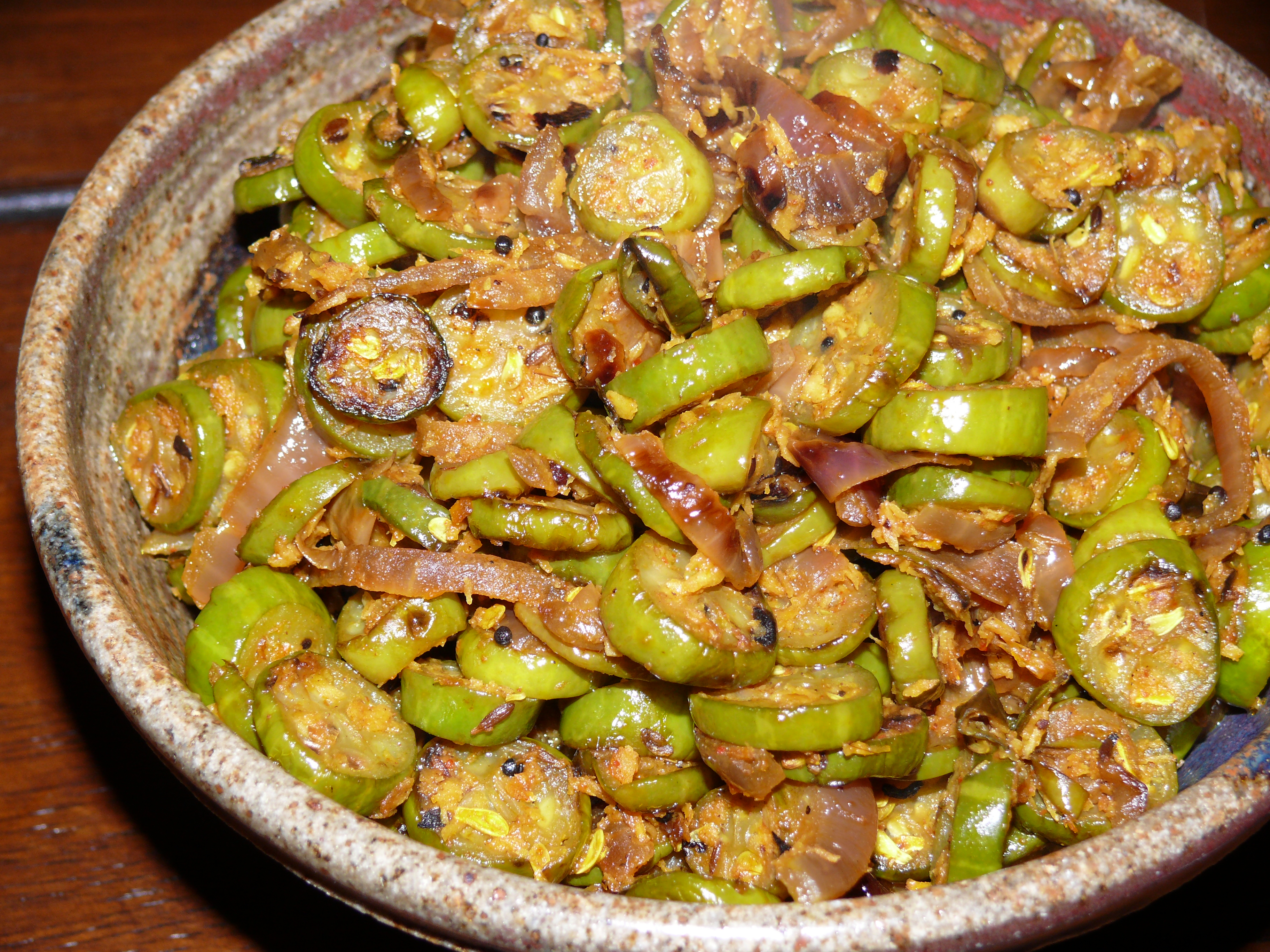 Love this tindora recipe because you cut the tindora into little rounds and add yummy browned onions! I found this recipe on Sailu’s Kitchen. Cutting the tindora is a little time consuming, but worth it.