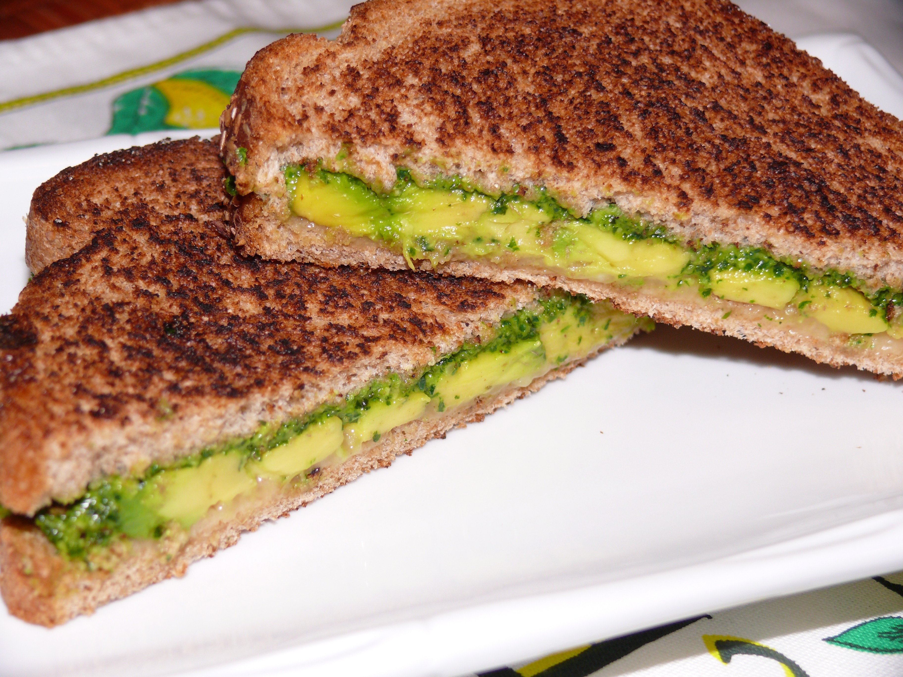- Lay a slice of cheese on one slice of bread. Add sliced avocado and sprinkle with salt. Lather the pesto on the other slice and lay it on top making a sandwich.